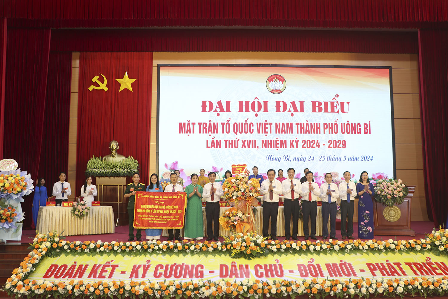 Các đồng chí BTV Thành ủy trao tặng Ủy ban MTTQ thành phố bức trướng mang dòng chữ: Đại hội đại biểu MTTQ Việt Nam thành phố Uông Bí lần thứ XVII, nhiệm kỳ 2024-2029 "Đoàn kết, Kỷ cương, Dân chủ, Đổi mới, Phát triển xây dựng thành phố Uông Bí giàu đẹp, văn minh, Nhân dân hạnh phúc".
