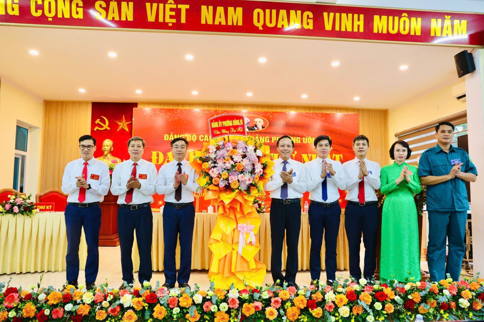 Đồng chí Nguyễn Chiến Thắng, Bí thư Đảng ủy, Chủ tịch HĐND phường Uông Bí tặng hoa chúc mừng Đại hội.