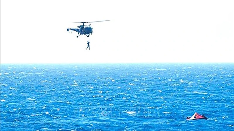 Trực thăng cứu hộ giải cứu thành viên thủy thủ đoàn sau vụ tấn công nhằm vào tàu chở hàng trên Vịnh Aden, Yemen, ngày 6/3/2024. (Ảnh: AFP/TTXVN)