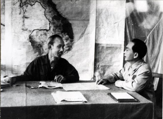 Thay mặt Trung ương Đảng và Chính phủ, Chủ tịch Hồ Chí Minh trực tiếp giao nhiệm vụ cho Đại tướng Võ Nguyên Giáp nghiên cứu kế hoạch tác chiến và mở Chiến dịch Điện Biên Phủ. (Ảnh: Tư liệu TTXVN)