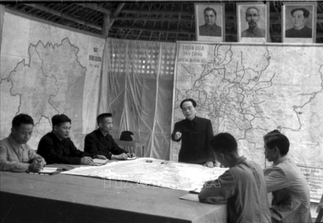 Đại tướng Võ Nguyên Giáp và Bộ Tổng tham mưu Quân đội nhân dân Việt Nam nghiên cứu kế hoạch tác chiến Chiến dịch Điên Biên Phủ. (Ảnh: Tư liệu TTXVN)