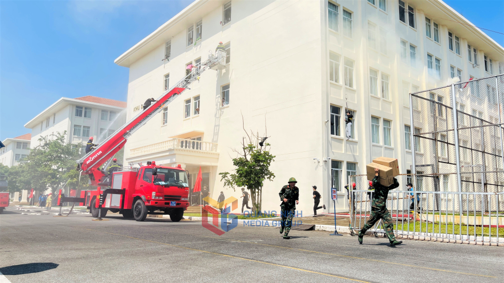 Thực tập phương án chữa cháy, cứu nạn, cứu hộ tại KCN Hải Yên (TP Móng Cái). Ảnh: Hồng Việt