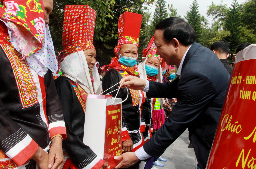 Đồng chí Nguyễn Xuân Ký, Ủy viên Trung ương Đảng, Bí thư Tỉnh ủy, Chủ tịch HĐND tỉnh, thăm, động viên, tặng quà Tết hộ nghèo vùng đồng bào DTTS các xã biên giới Quảng Đức (Hải Hà), Hải Sơn và Bắc Sơn (TP Móng Cái). Ảnh: Thu Chung