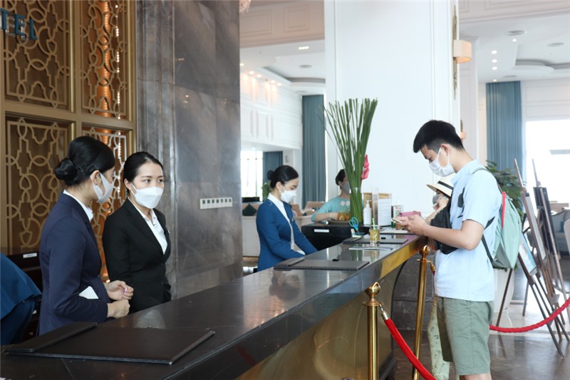 Nhân viên và du khách tại khách sạn FLC Hạ Long đeo khẩu trang để đảm bảo an toàn.