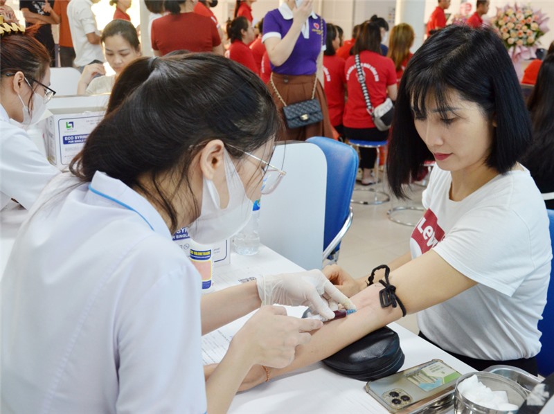 Tình nguyện viên tham gia HMTN ở Điểm hiến máu Chữ thập đỏ tại Bệnh viện Bãi Cháy.