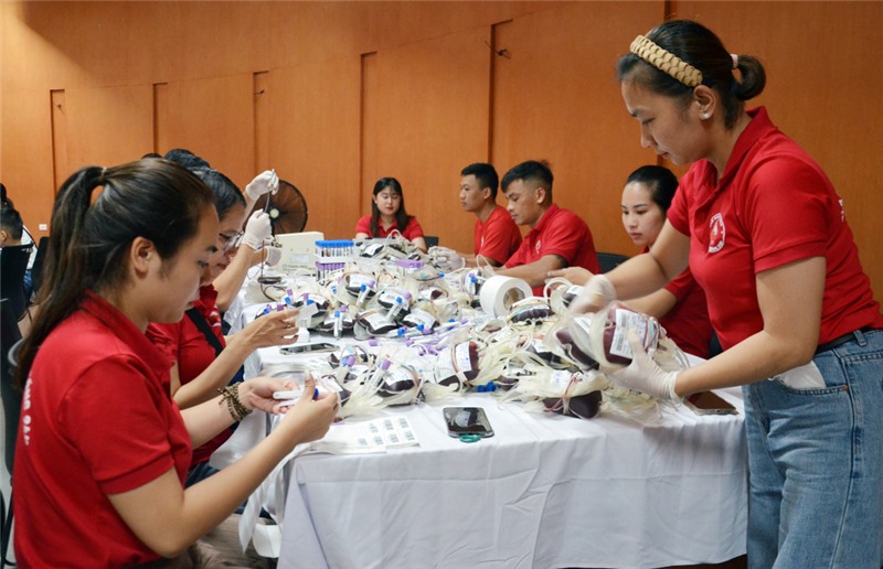 Tình nguyện viên CLB Ngân hàng máu sống 24h thực hiện gom máu sau khi được hiến đưa về bệnh viện.