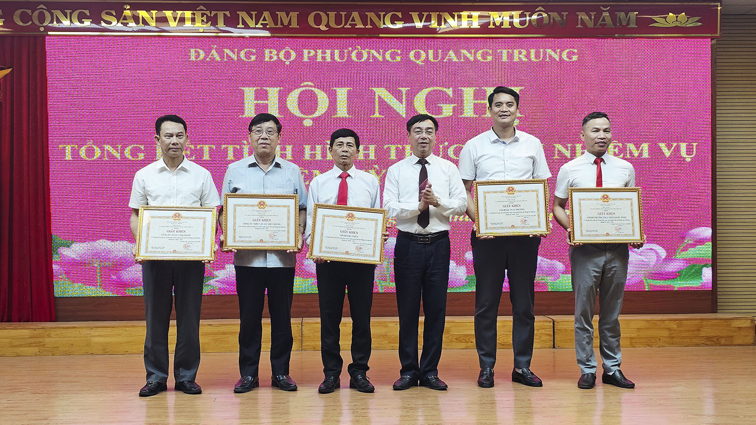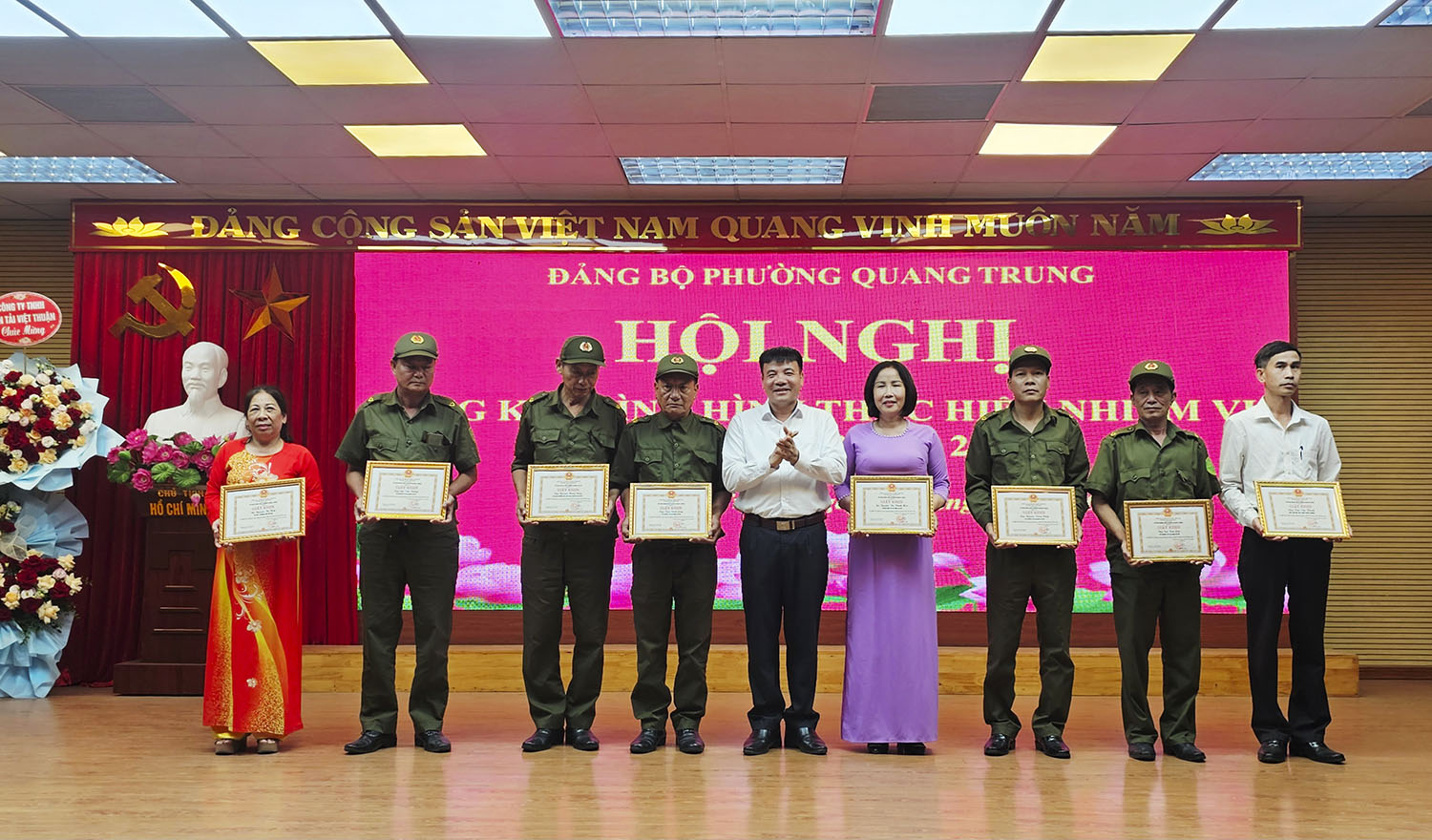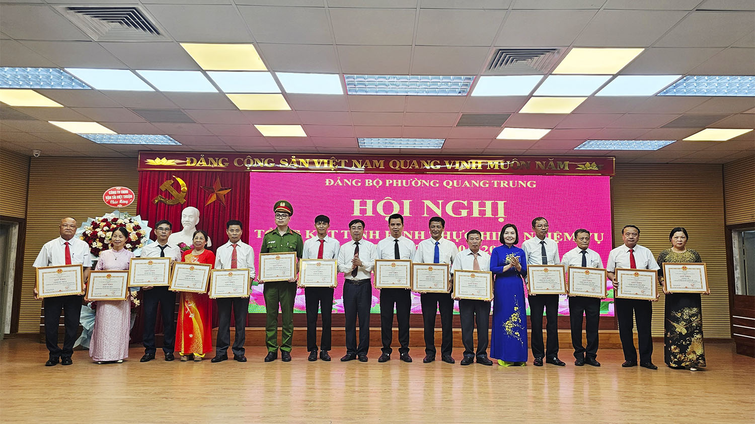 Nhân dịp này, Đảng bộ phường Quang Trung đã tổ chức biểu dương, khen thưởng các tập thể, cán bộ, đảng viên có thành tích tiêu biểu trong nhiệm kỳ 2020-2025. Hội nghị cũng khen thưởng các tập thể, cá nhân có thành tích xuất sắc trong Học tập và làm theo tư tưởng, đạo đức, phong cách Hồ Chí Minh, trong công tác dân vận và công tác phòng, chống tội phạm trong tình hình mới.