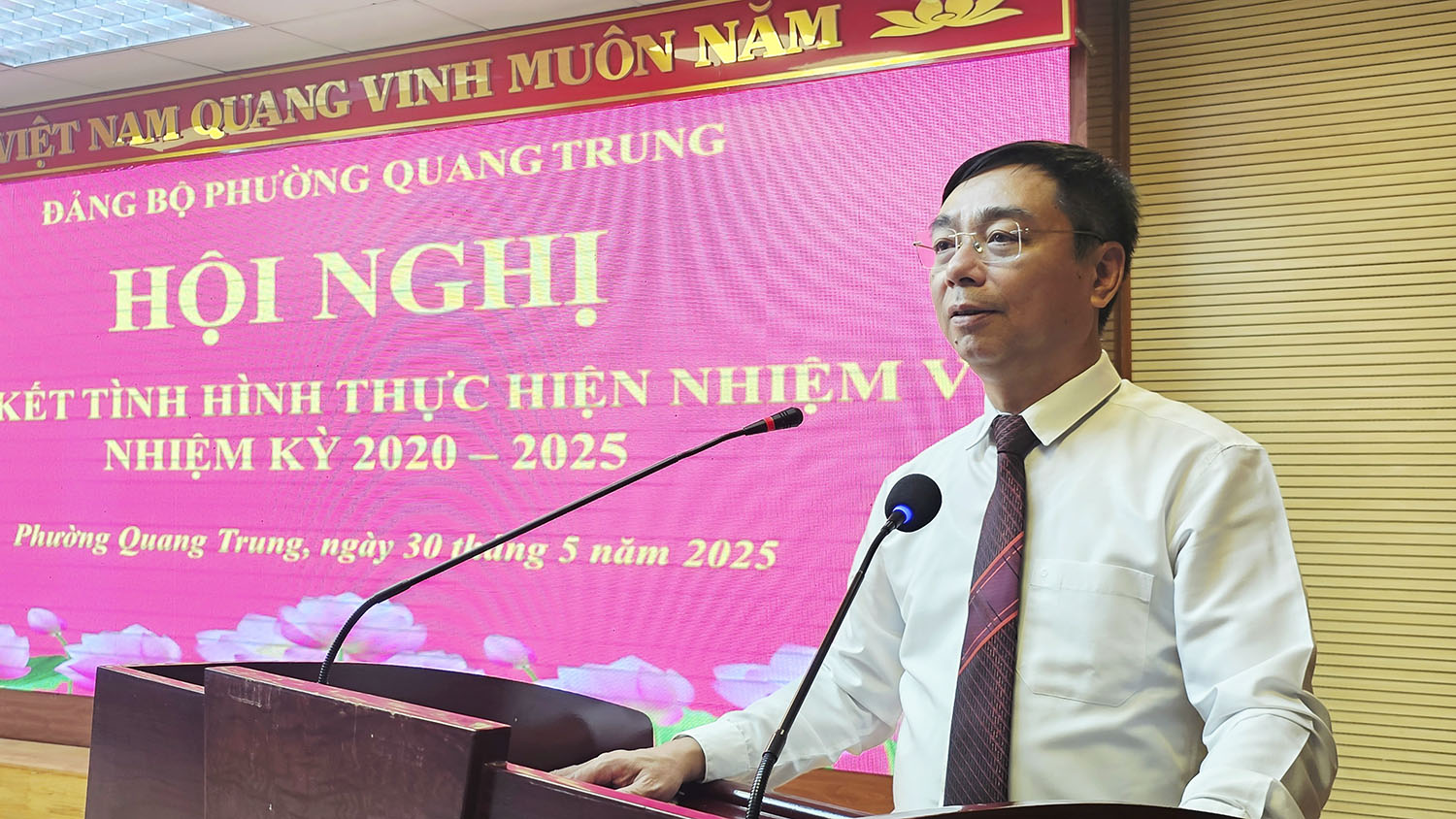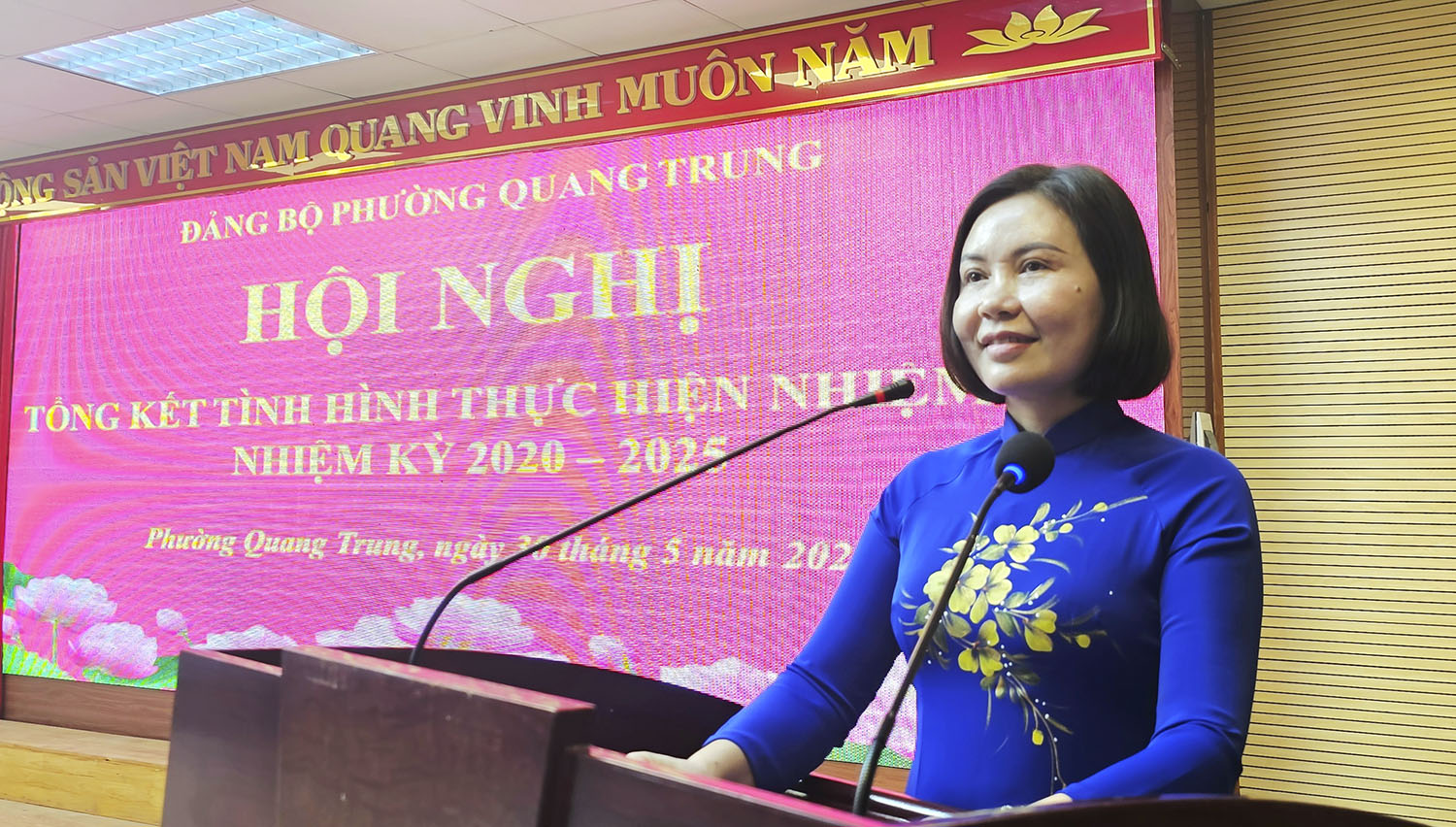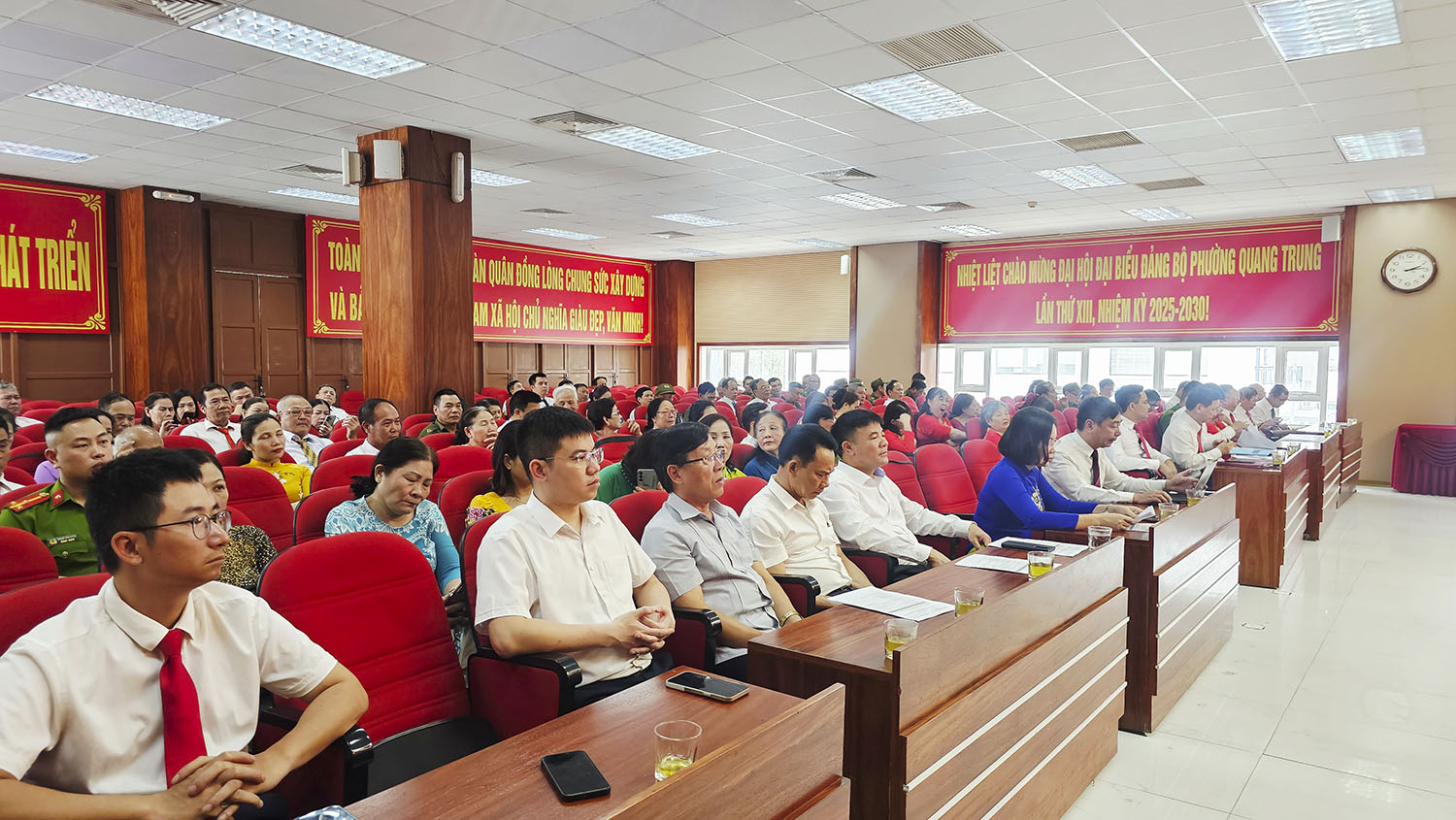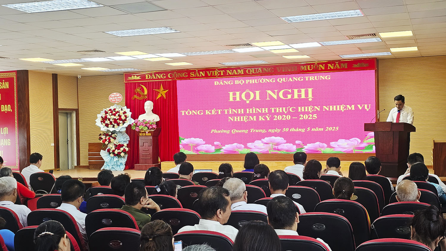 Nhân dịp này, Đảng bộ phường Quang Trung đã tổ chức biểu dương, khen thưởng các tập thể, cán bộ, đảng viên có thành tích tiêu biểu trong nhiệm kỳ 2020-2025. Hội nghị cũng khen thưởng các tập thể, cá nhân có thành tích xuất sắc trong Học tập và làm theo tư tưởng, đạo đức, phong cách Hồ Chí Minh, trong công tác dân vận và công tác phòng, chống tội phạm trong tình hình mới.