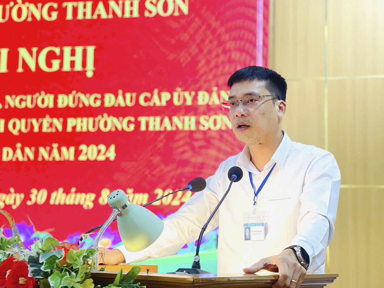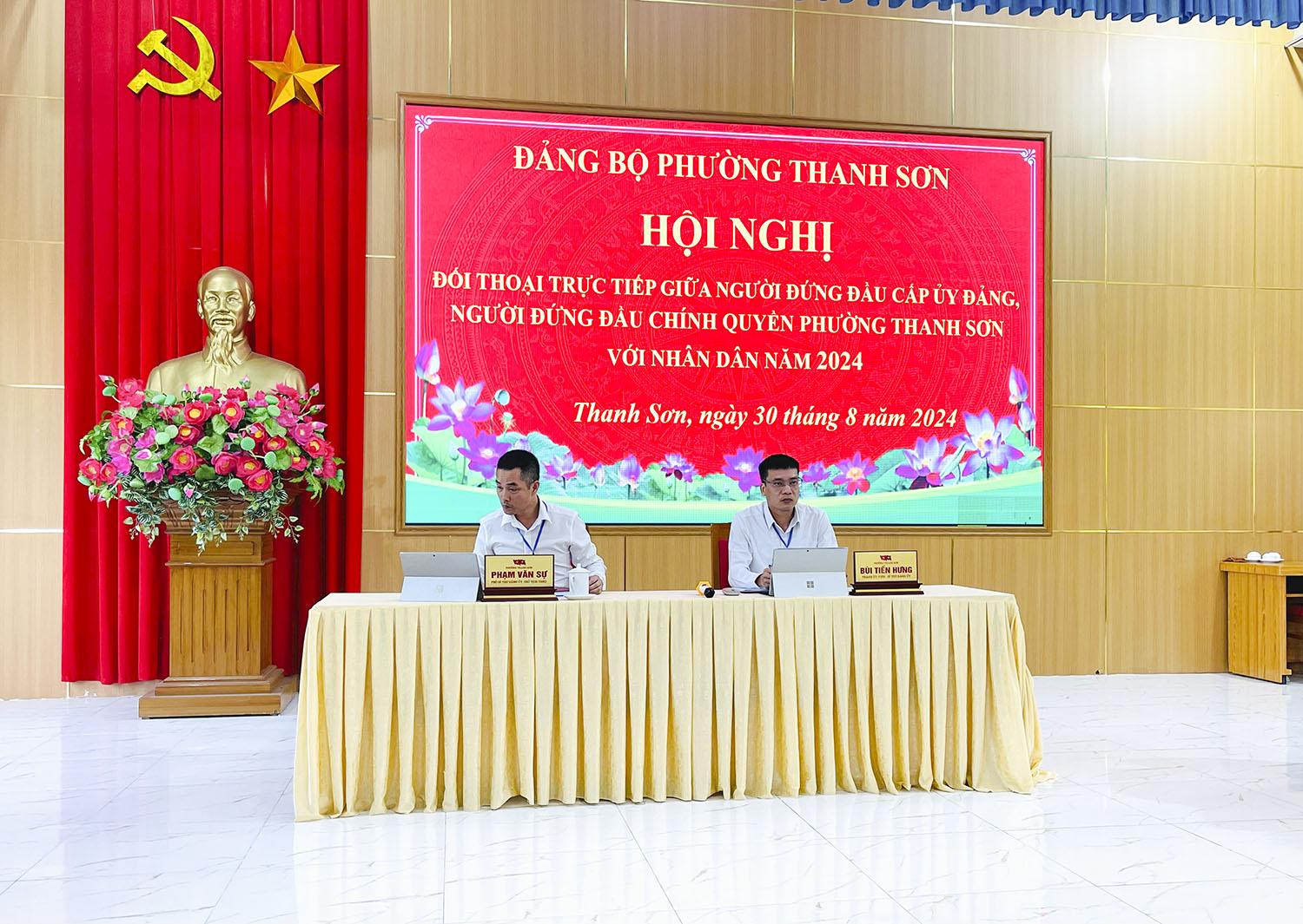 Mới đây, phường Thanh Sơn tổ chức hội nghị đối thoại người đứng đầu cấp uỷ Đảng, chính quyền với Nhân dân năm 2024. Đồng chí Bùi Tiến Hưng, Uỷ viên BCH Đảng bộ thành phố, Bí thư Đảng uỷ phường; đồng chí Phạm Văn Sự, Phó Bí thư Đảng uỷ, Chủ tịch UBND phường chủ trì hội nghị.
