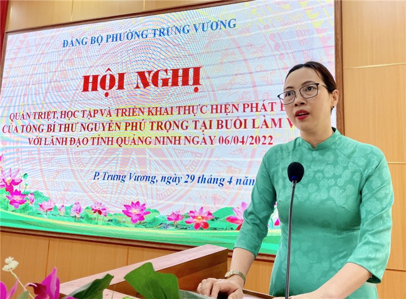 Đồng chí Nguyễn Lan Anh, UVBTV Thành uỷ, Bí thư Đảng uỷ, Chủ tịch UBND phường Trưng Vương quán triệt các nội dung.