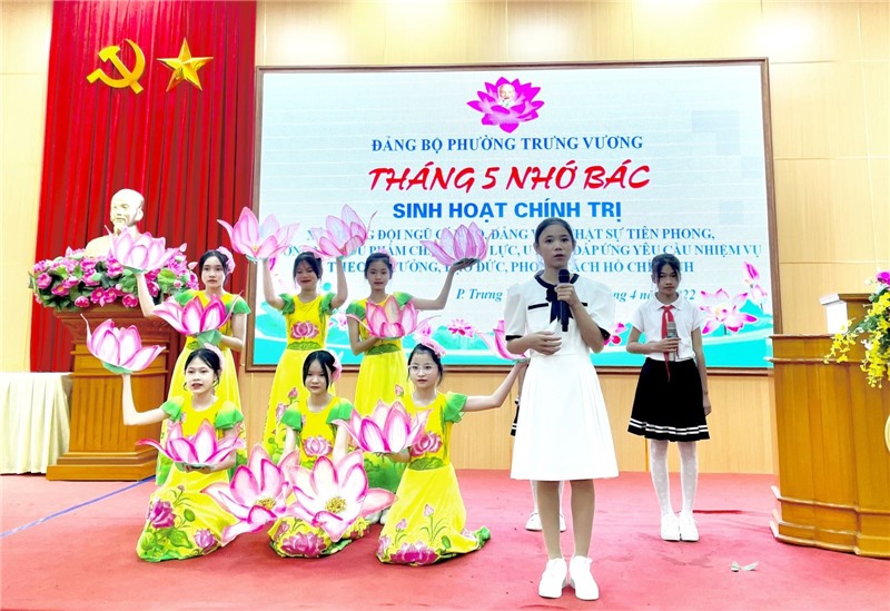 Tại chương trình, cán bộ, đảng viên, thiếu nhi phường Trưng Vương đã được nghe đồng chí Bí thư Đảng ủy phường quán triệt nội dung chuyên đề học tập và làm theo tư tưởng, đạo đức, phong cách Hồ Chí Minh năm 2022; quán triệt triển khai Phát biểu của Tổng Bí thư Nguyễn Phú Trọng trong chuyến thăm và làm việc tại Quảng Ninh ngày 06/4/2022; đại diện một số cấp ủy chi bộ trực thuộc Đảng bộ phường trình bày nội dung cơ bản của chuyên đề học tập năm 2022, những giải pháp để thực hiện tốt công tác cán bộ và xây dựng cán bộ; nghe thiếu nhi kể chuyện về Bác; đồng thời ôn lại một số sự kiện lịch sử chính trị gắn với truyền thống, đặc điểm của TP Uông Bí và tỉnh Quảng Ninh.