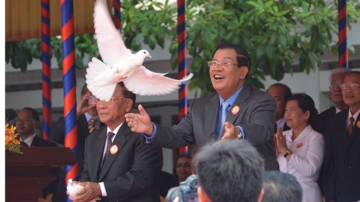 Chủ tịch CPP, Thủ tướng Samdech Hun Sen và Chủ tịch danh dự CPP, Chủ tịch Quốc hội Heng Somrin thả chim hòa bình tại buổi lễ.