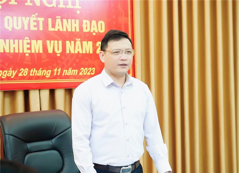 Đồng chí Phạm Tuấn Đạt - PBT Thành uỷ, Chủ tịch UBND thành phố phát biểu tại hội nghị.