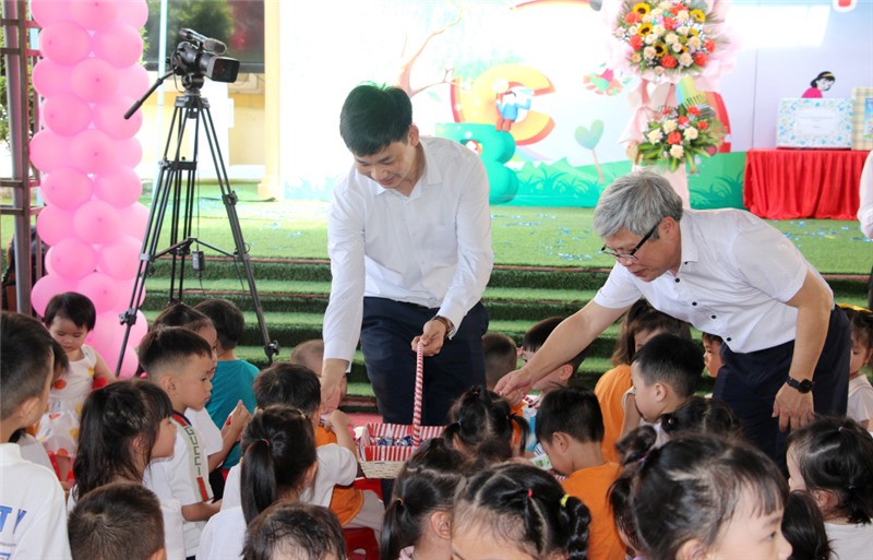 Lãnh đạo TX Đông Triều và Sở LĐ-TB&XH chia quà, chung vui cùng các cháu Trường Mầm non Hoa Phượng nhân ngày Quốc tế Thiếu nhi (1/6). Ảnh: Mạnh Trường