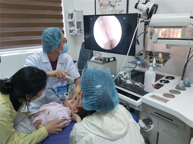Nội soi tai, mũi, họng cho trẻ tại Bệnh viện Sản Nhi tỉnh. Ảnh: Thu Nguyệt