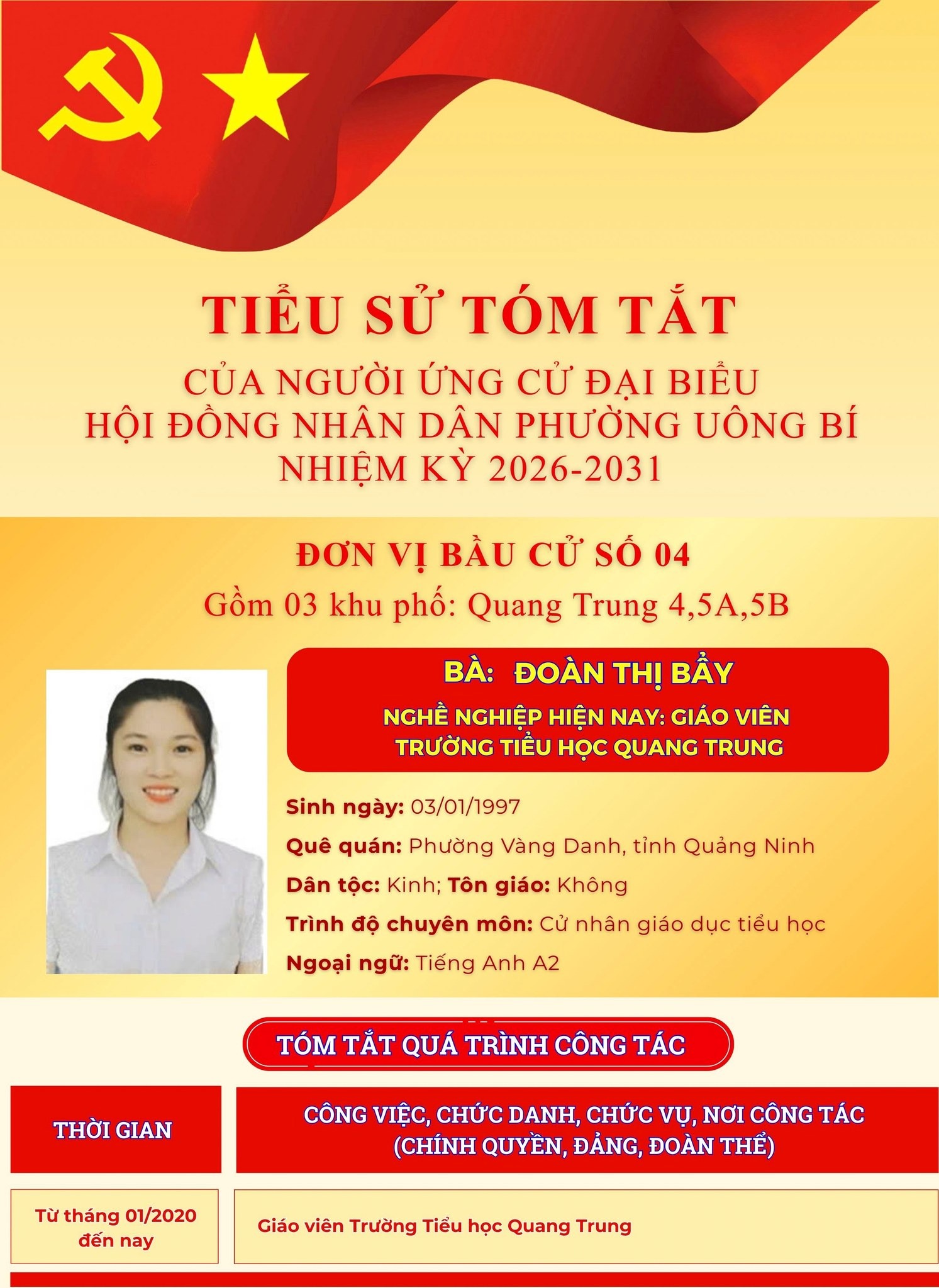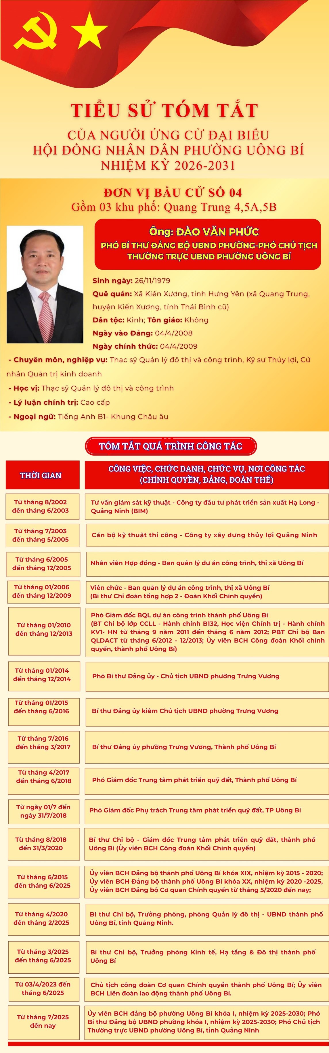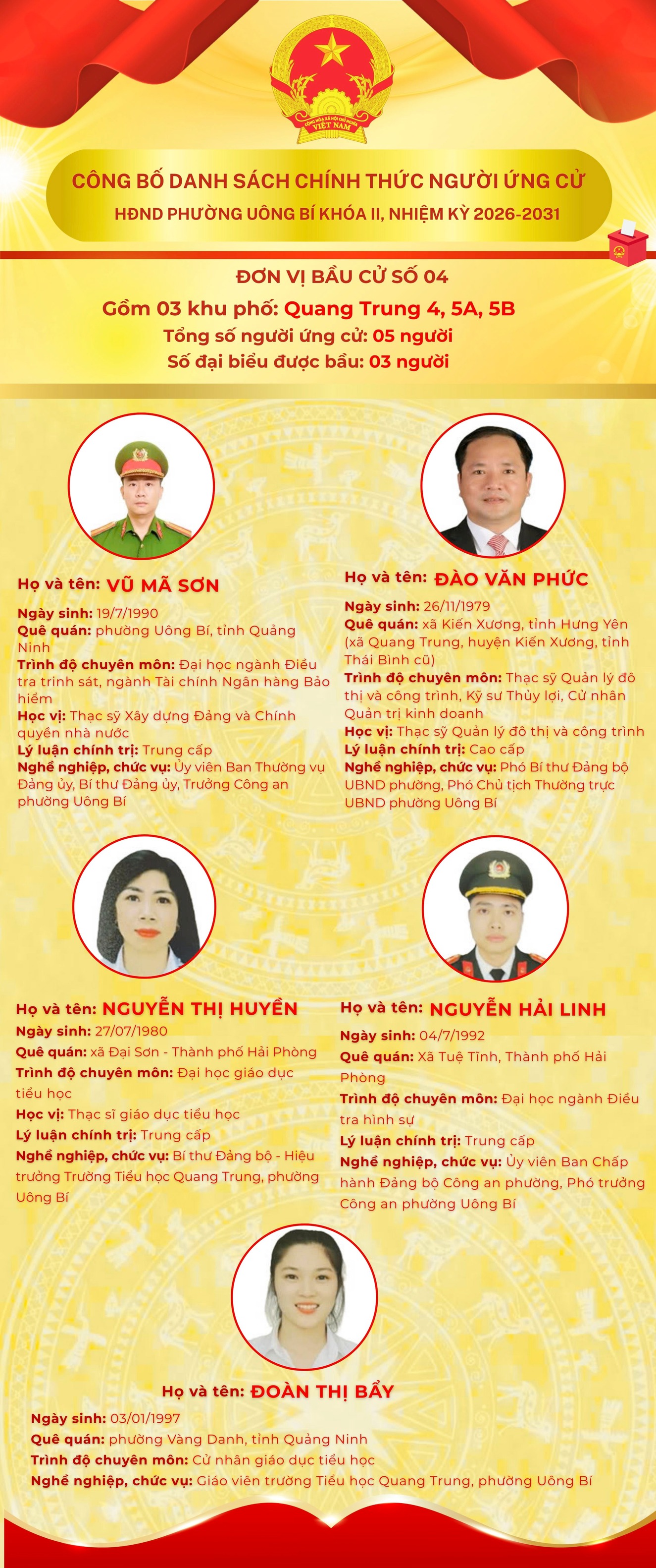 DANH SÁCH CHÍNH THỨC NHỮNG NGƯỜI ỨNG CỬ ĐẠI BIỂU HỘI ĐỒNG NHÂN DÂN PHƯỜNG UÔNG BÍ KHÓA II NHIỆM KỲ 2026 - 2031