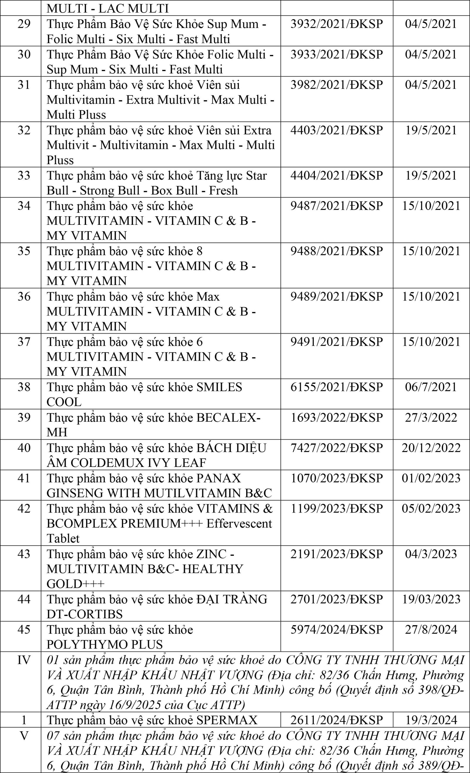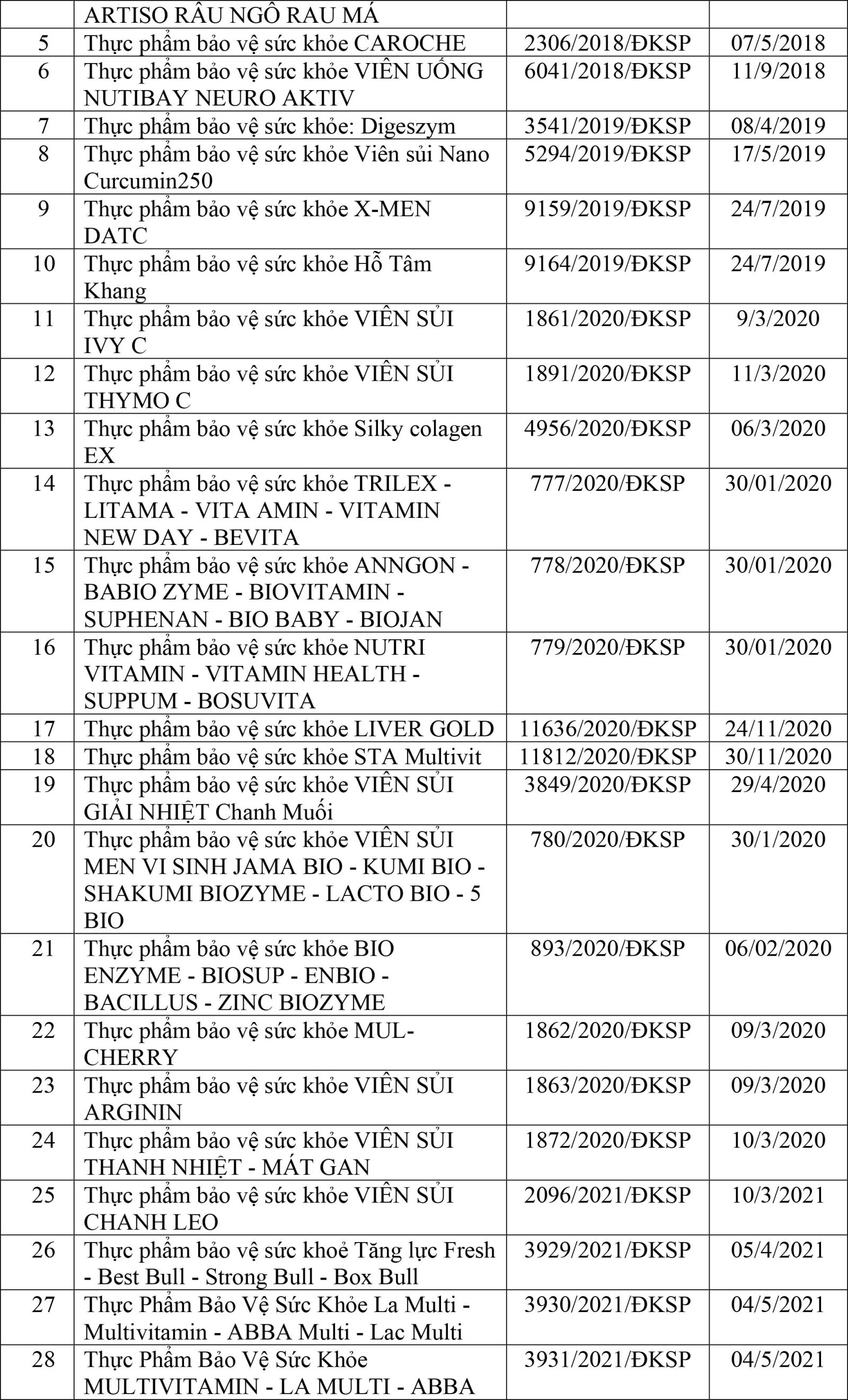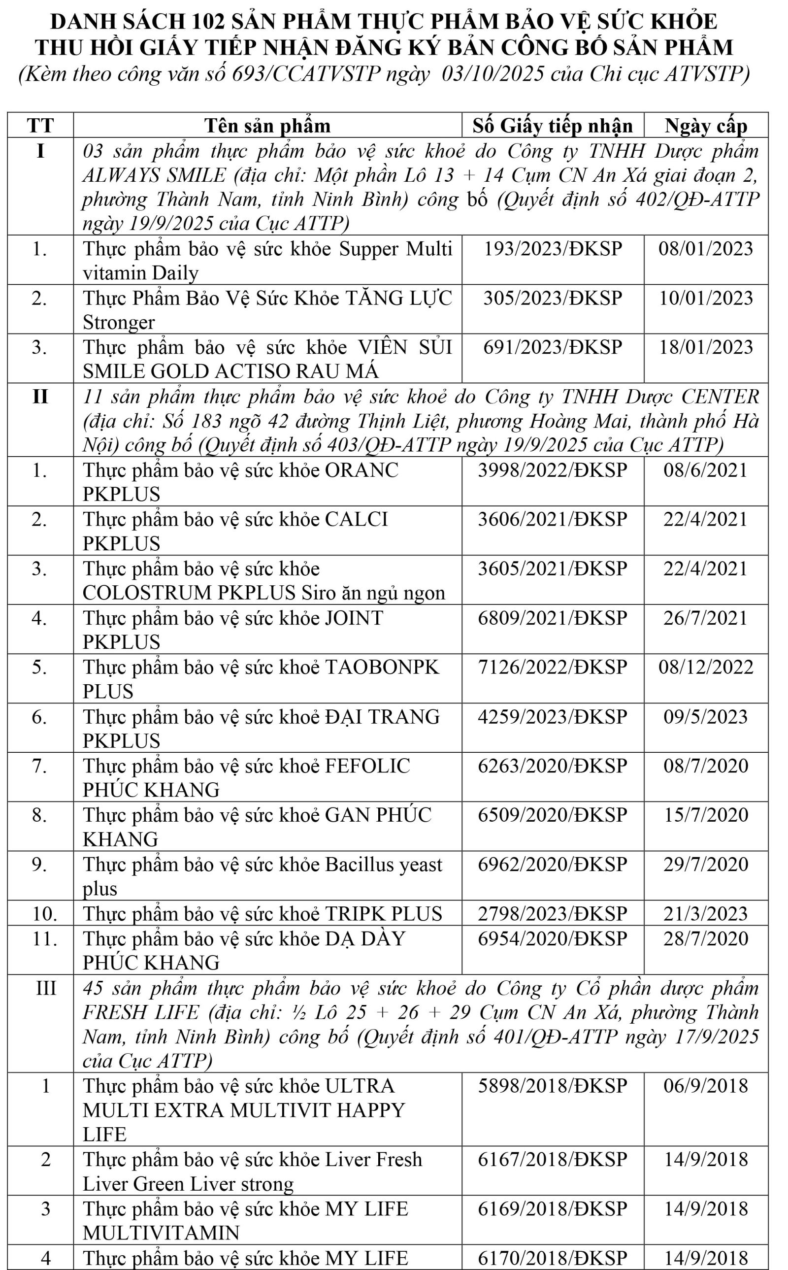 DANH SÁCH 102 SẢN PHẨM THỰC PHẨM BẢO VỆ SỨC KHỎE THU HỒI GIẤY TIẾP NHẬN ĐĂNG KÝ BẢN CÔNG BỐ SẢN PHẨM