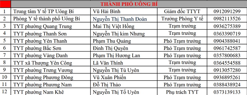 Danh sách đường dây tiếp nhận thông tin kết quả test nhanh sàng lọc Covid-19 trên địa bàn thành phố Uông Bí