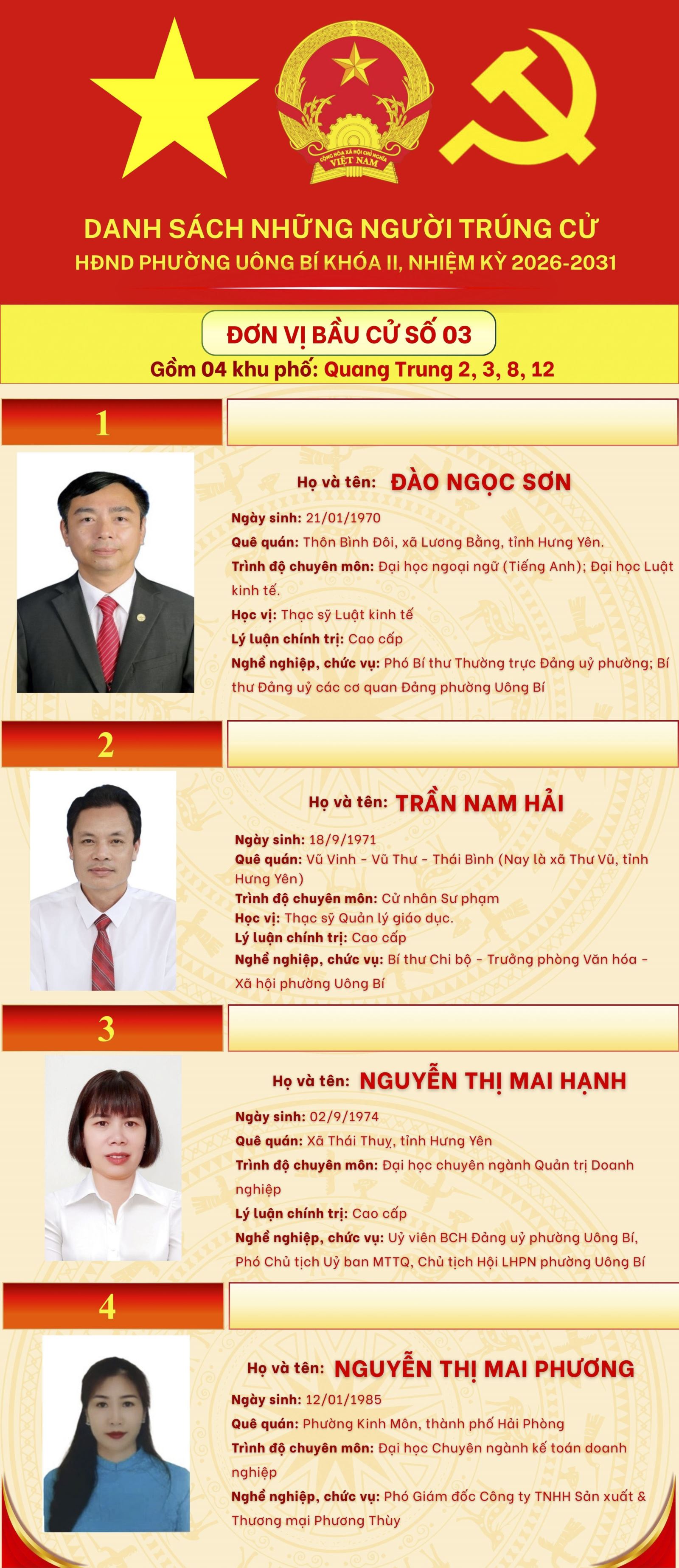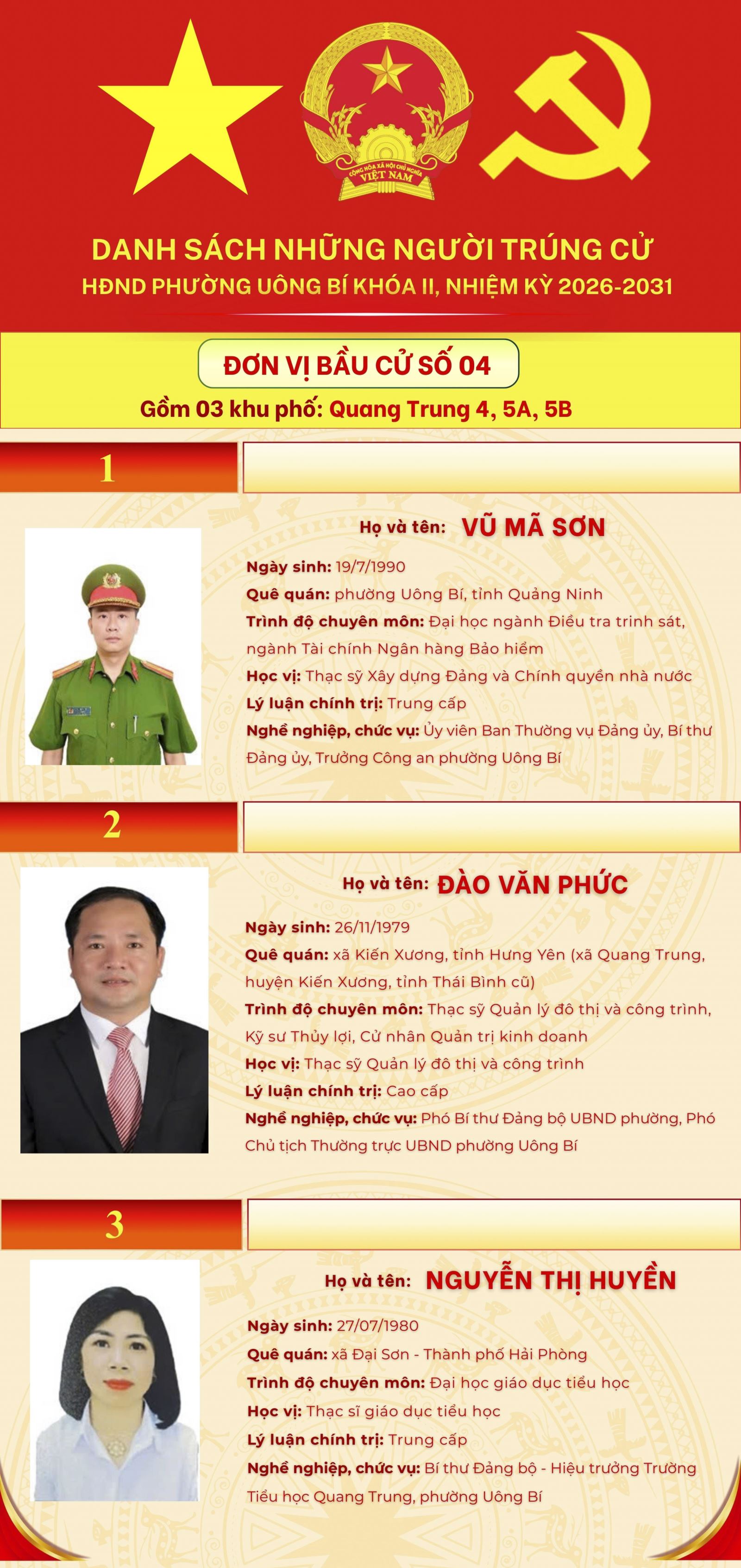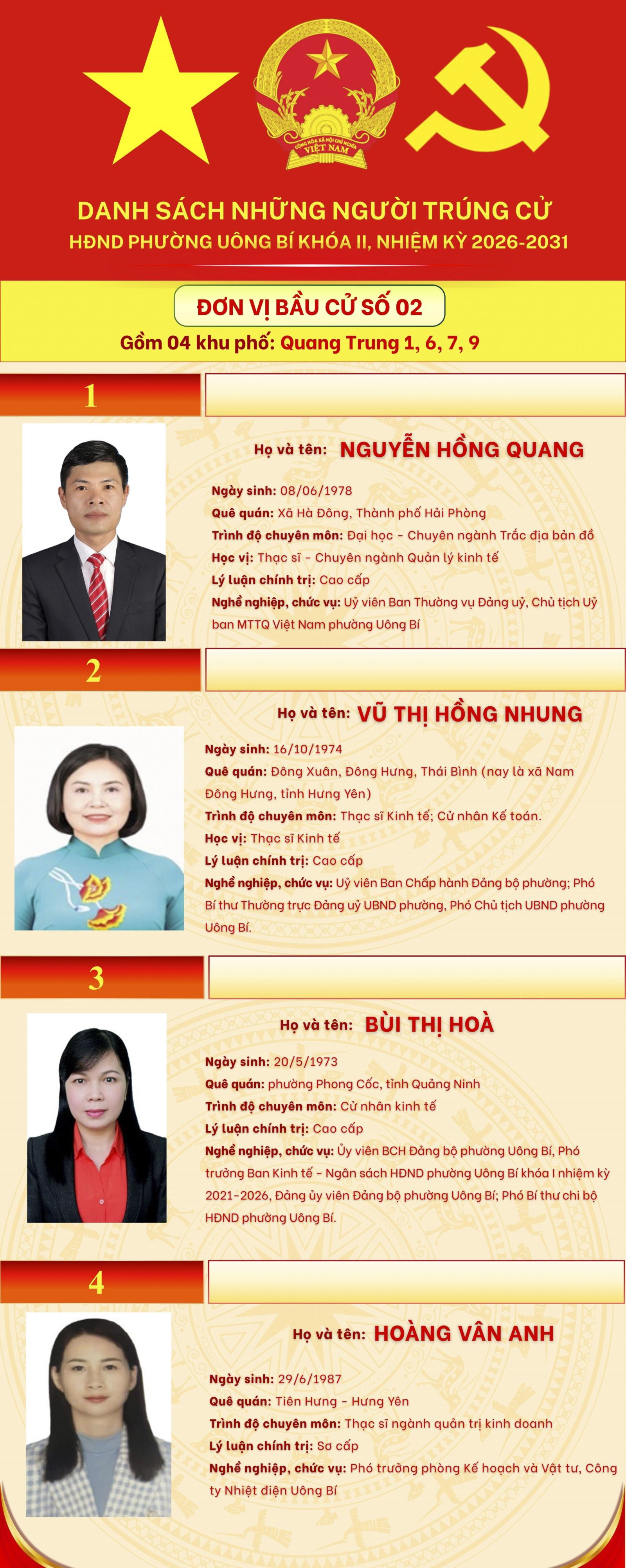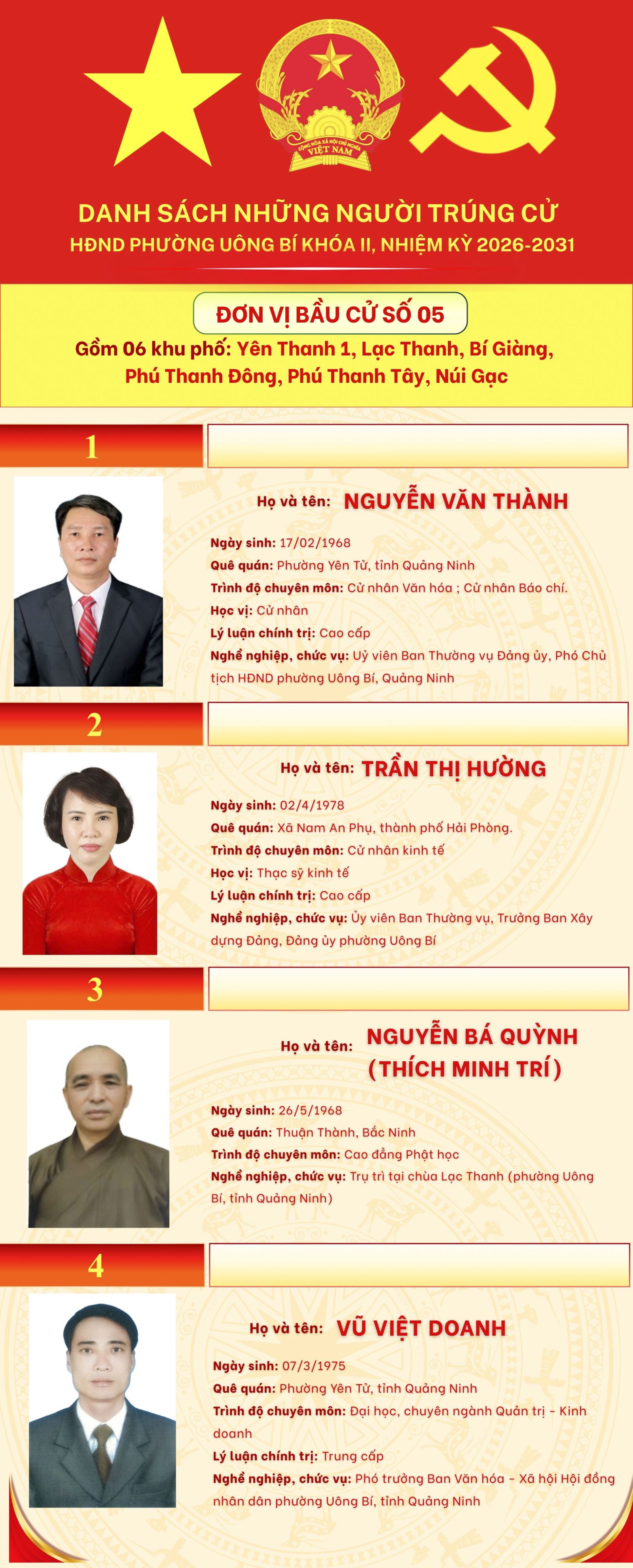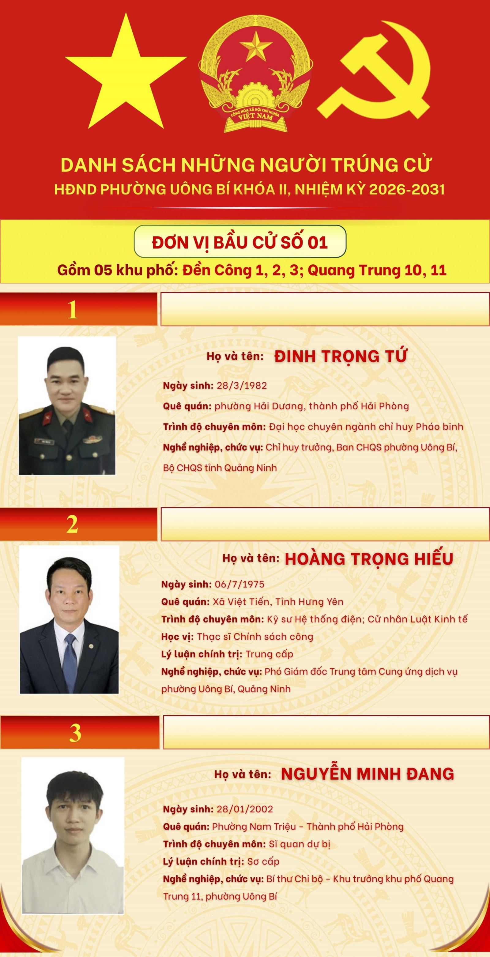 DANH SÁCH NHỮNG NGƯỜI TRÚNG CỬ HĐND PHƯỜNG UÔNG BÍ KHÓA II, NHIỆM KỲ 2026-2031 (7 ĐƠN VỊ BẦU CỬ)