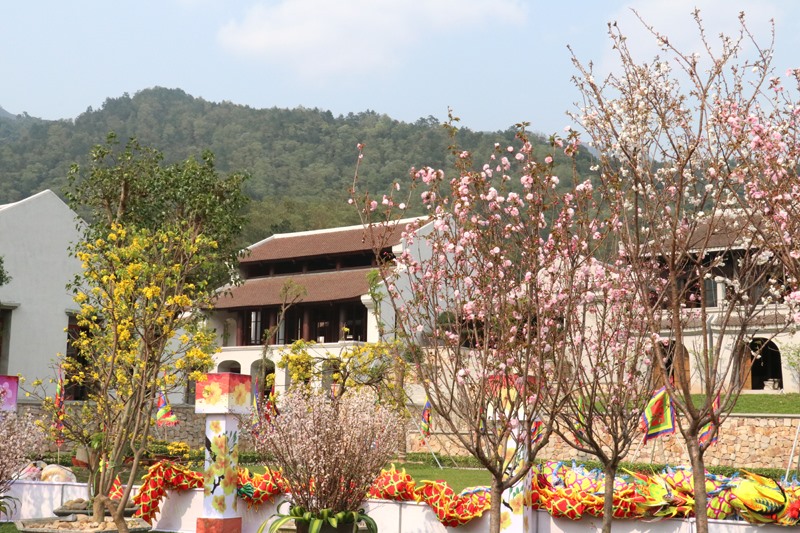 Trong không gian cổ kính, mang đậm kiến trúc văn hóa đời Trần của Trung tâm Văn hóa Trúc Lâm Yên Tử, hoa Anh Đào - Mai Vàng như càng được tôn thêm vẻ đẹp thuần khiết.