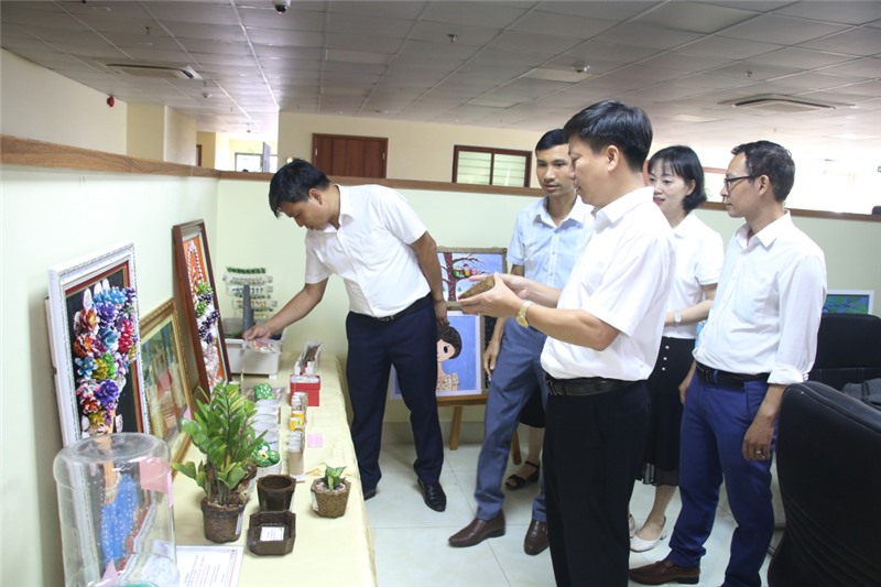 Các thành viên Hội đồng giám khảo và các tiểu ban giám khảo tham quan các mô hình, sản phẩm dự thi ở lĩnh vực Sản phẩm thân thiện với môi trường.