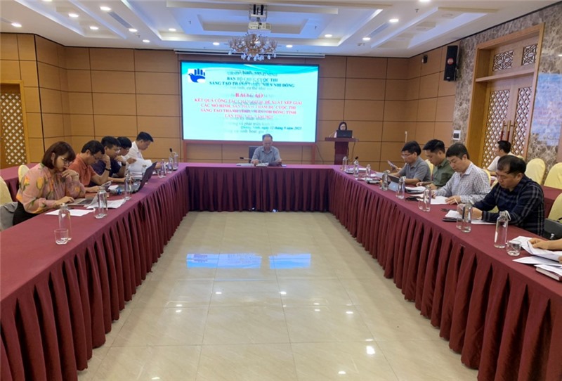 Quang cảnh cuộc họp thông qua kết quả đánh giá, chấm điểm và đề xuất xếp giải cho các mô hình, sản phẩm dự thi.