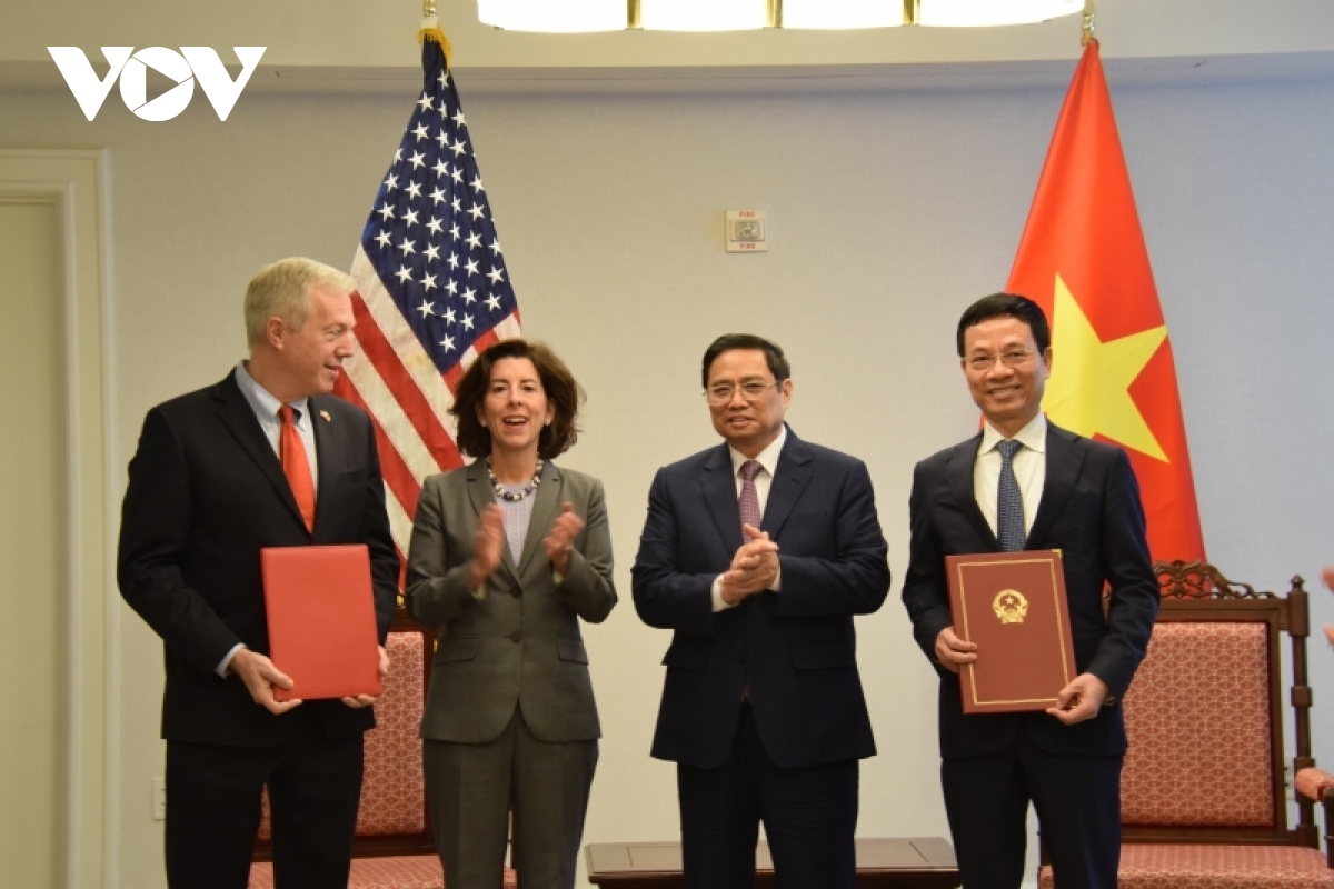 Thủ tướng Chính phủ Phạm Minh Chính và Bộ trưởng Thương mại Raimondo chứng kiến lễ trao các văn kiện hợp tác giữa các bộ, ngành, doanh nghiệp hai nước.