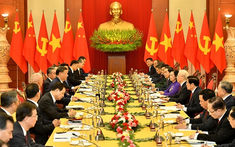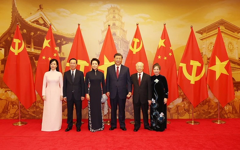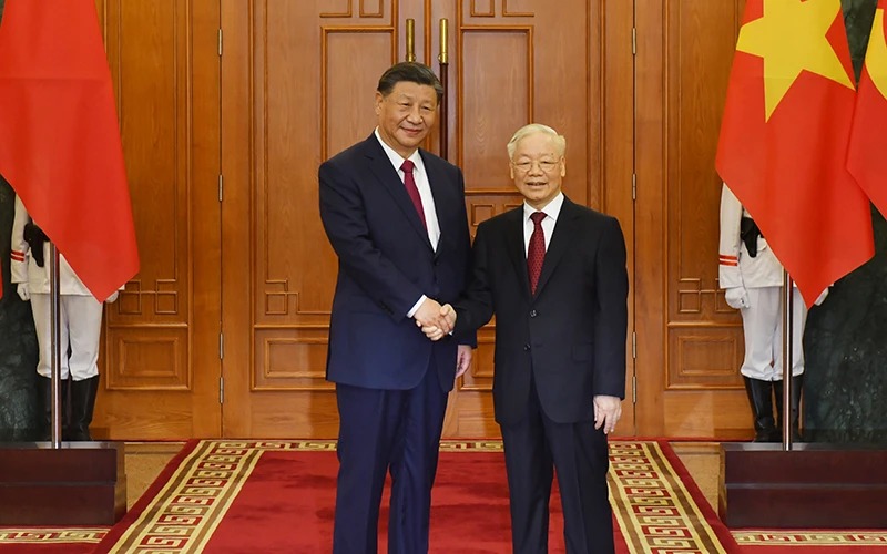 Tổng Bí thư Nguyễn Phú Trọng bày tỏ vui mừng và nhiệt liệt chào mừng Tổng Bí thư, Chủ tịch nước Tập Cận Bình cùng Phu nhân và Đoàn đại biểu cấp cao Đảng, Nhà nước Trung Quốc sang thăm cấp Nhà nước Việt Nam, nhấn mạnh chuyến thăm Việt Nam lần thứ ba của Tổng Bí thư, Chủ tịch Trung Quốc Tập Cận Bình diễn ra đúng vào dịp hai nước kỷ niệm 15 năm thiết lập quan hệ Đối tác hợp tác chiến lược toàn diện (2008-2023), thể hiện tình cảm đặc biệt của Tổng Bí thư, Chủ tịch nước Tập Cận Bình đối với truyền thống hữu nghị, tầm vóc quan hệ song phương hiện nay cũng như triển vọng tốt đẹp trong thời gian tới của quan hệ hai nước.