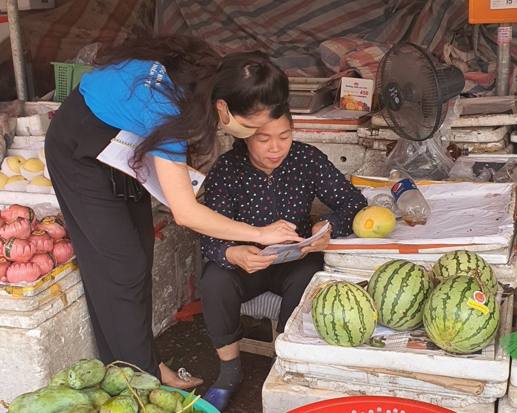 Nhân viên BHXH huyện Hải Hà tuyên truyền, hướng dẫn các tiểu thương chợ trung tâm Hải Hà 2 (huyện Hải Hà) tham gia BHXH tự nguyện.