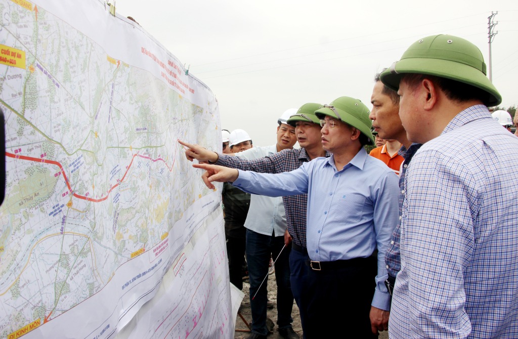 Đồng chí Nguyễn Xuân Ký, Bí thư Tỉnh ủy, Chủ tịch HĐND tỉnh, kiểm tra tiến độ thi công đường ven sông kết nối cao tốc Hạ Long - Hải Phòng đến TX Đông Triều, tháng 4/2024.