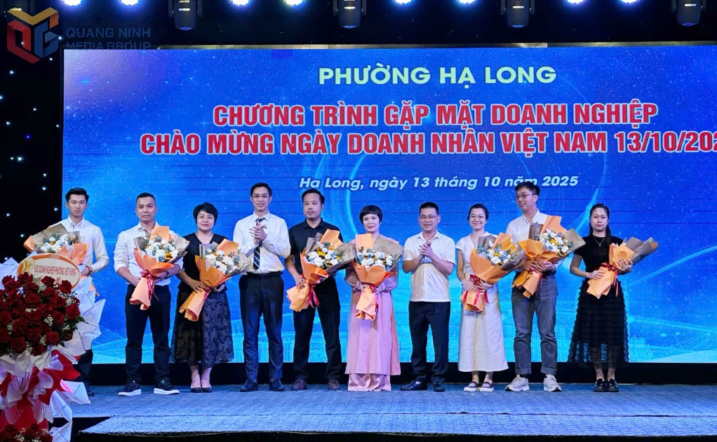 Lãnh đạo phường Hạ Long tặng hoa chúc mừng các doanh nghiệp thành lập mới.