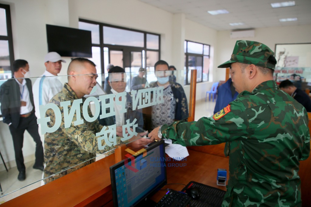 Các lực lượng chức năng tại khu vực Lối mở Cầu phao tạm Km3+4 Hải Yên huy động đủ quân số, đảm bảo hoạt động thông quan hàng hóa XNK nhanh gọn. Ảnh: Song Hà
