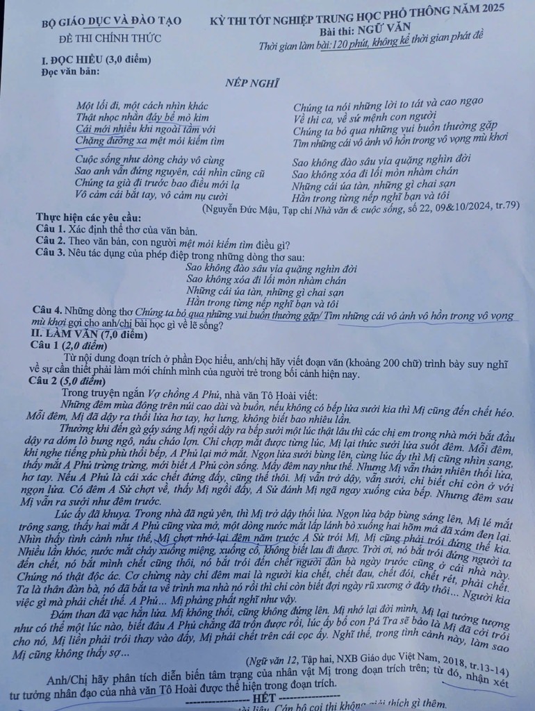 Bài học về lẽ sống, sự cần thiết phải làm mới chính mình, trích đoạn tác phẩm Vợ chồng A Phủ của nhà văn Tô Hoài,...là những nội dung trong đề Ngữ văn chính thức của Kỳ thi tốt nghiệp trung học phổ thông năm 2025 dành cho các thí sinh theo Chương trình giáo dục phổ thông 2006.