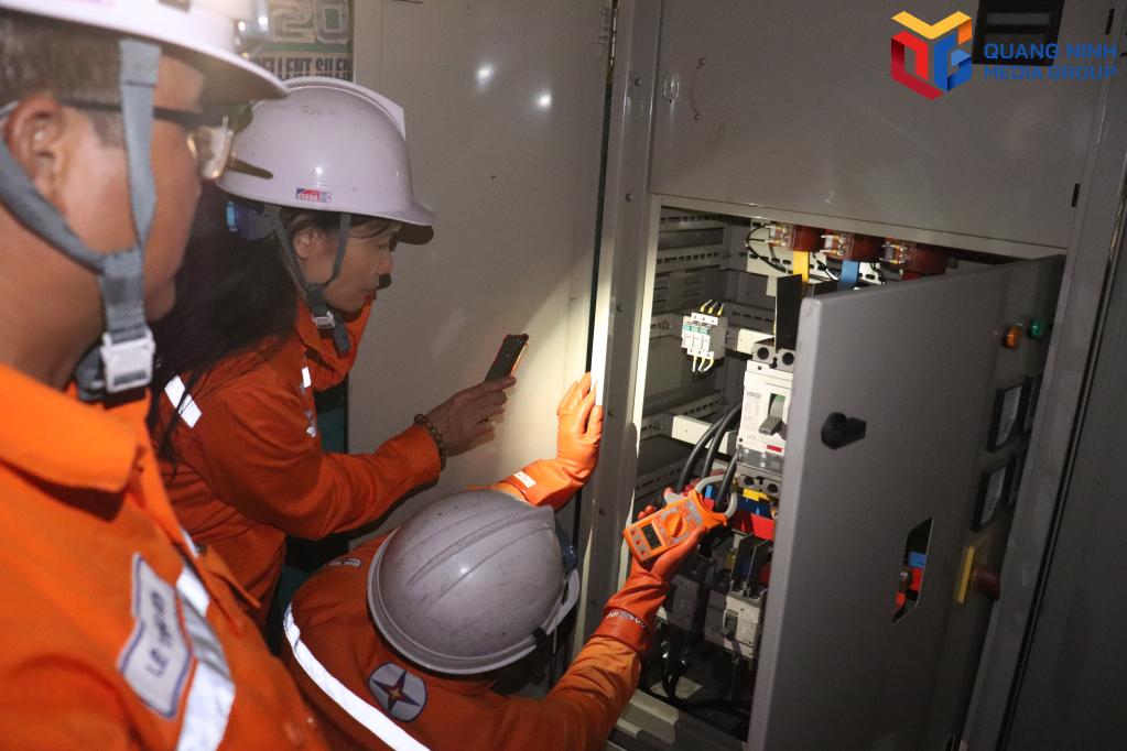 Công nhân Điện lực TP Uông Bí túc trực đảm bảo điện lưới cho sự kiện.