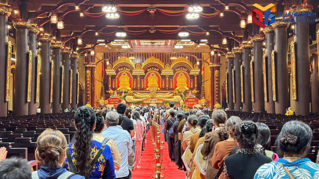Người dân xếp hàng ngay ngắn bước vào Cung Trúc Lâm với lòng thành kính, để chiêm bái xá lợi.