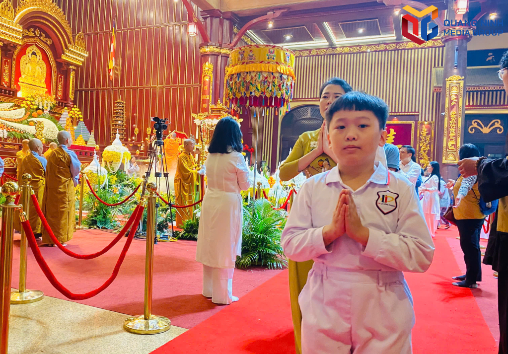 Em nhỏ thành tâm đến chiêm bái xá lợi.