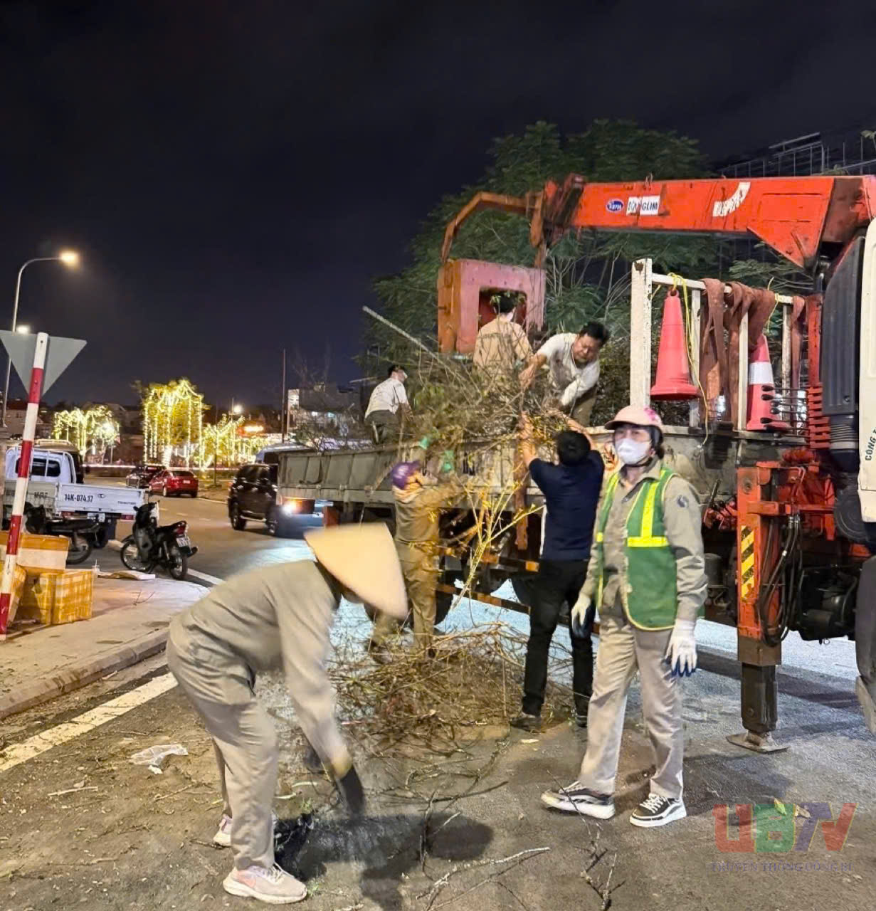 Những cành cây khô sau khi thay mới, thùng xốp, bao bì, vật dụng cũ… chất thành từng đống lớn. Xe thu gom liên tục ra vào, tiếng xúc rác, kéo cành, bốc xếp vang lên trong màn đêm tĩnh lặng. Người quét dọn, người thu gom, người bốc xếp, người điều khiển xe… tất cả phối hợp nhịp nhàng để giải phóng từng điểm rác tồn đọng, trả lại sự thông thoáng cho đường phố.