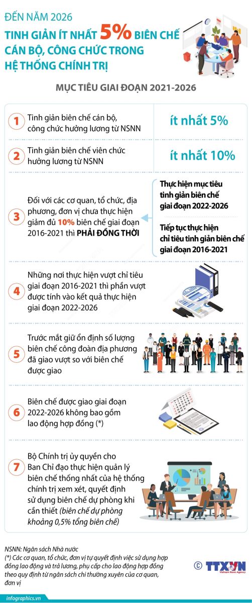 Theo Kết luận của Bộ Chính trị về nâng cao hiệu quả công tác quản lý biên chế của hệ thống chính trị giai đoạn 2022-2026, toàn hệ thống chính trị tinh giản ít nhất 5% biên chế cán bộ, công chức...