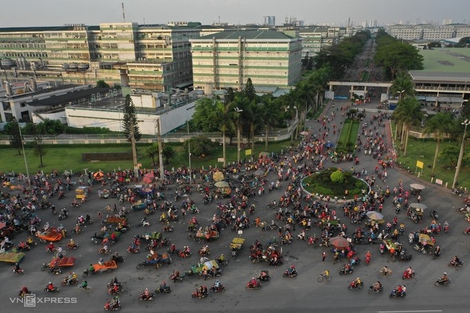 Hàng trăm người và xe nhộn nhịp trước khuôn viên công ty vào giờ tan tầm, ngày 4/6. Ảnh: Hữu Khoa.