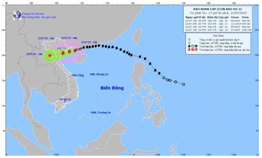 Bản đồ dự báo quỹ đạo và cường độ bão số 3 phát lúc 17h00 ngày 21/7/2025.