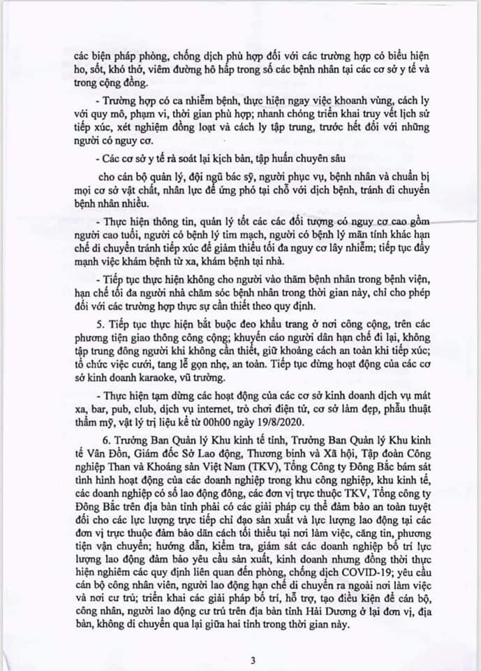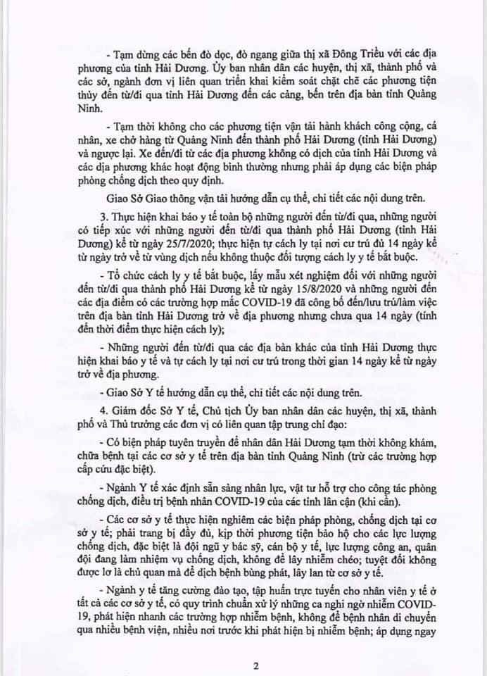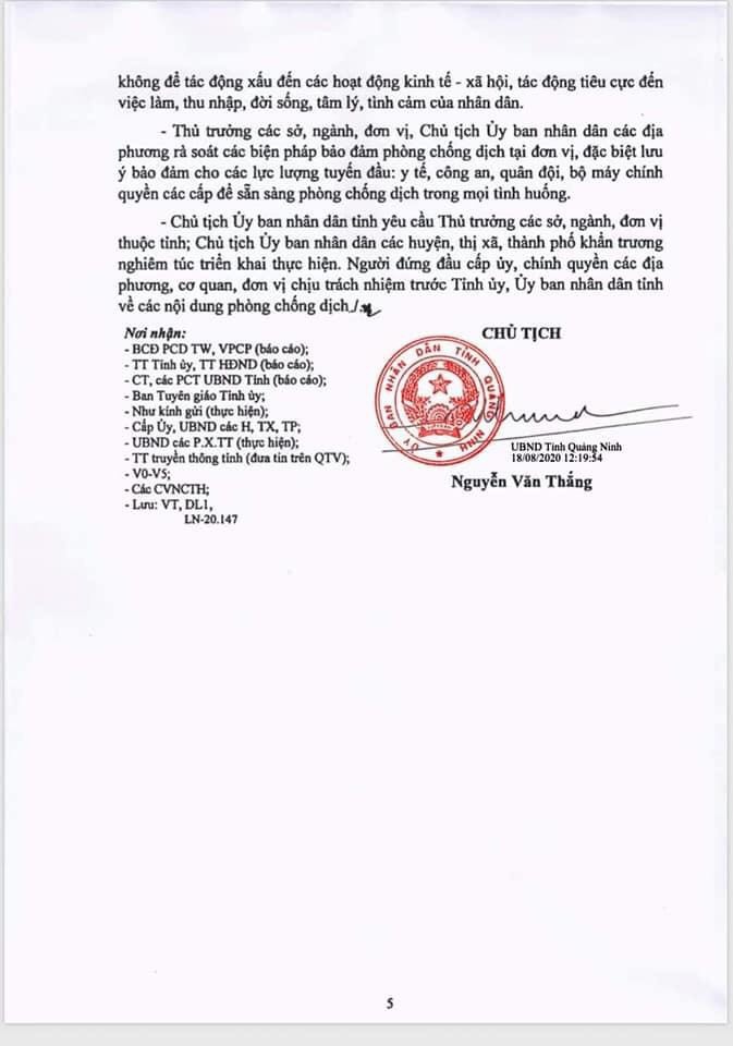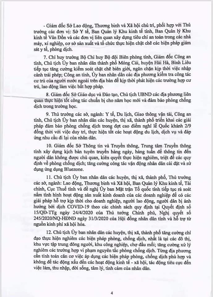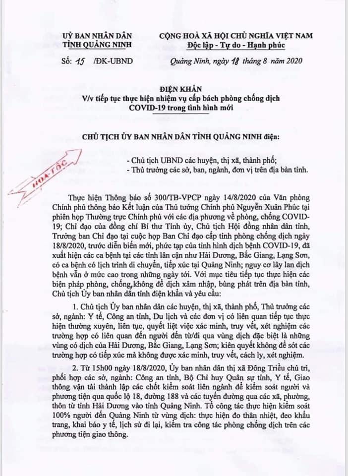 Ngày 18-8, Ủy ban nhân dân tỉnh Quảng Ninh ban hành Điện khẩn số 15/ĐK-UBND: V/v tiếp tục thực hiện nhiệm vụ cấp bách phòng chống dịch COVID-19 trong tình hình mới.