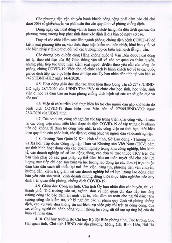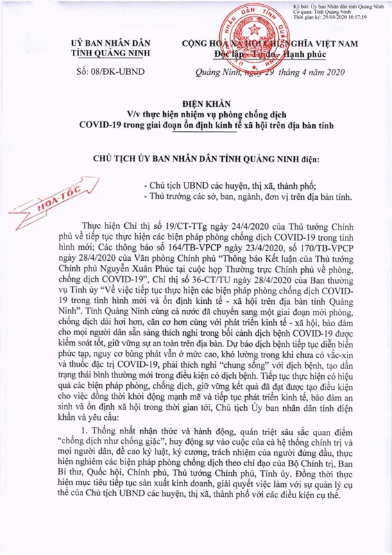 Điện khẩn của UBND tỉnh Quảng Ninh về việc thực hiện nhiệm vụ phòng, chống dịch COVID-19 trong giai đoạn ổn định KT-XH trên địa bàn tỉnh