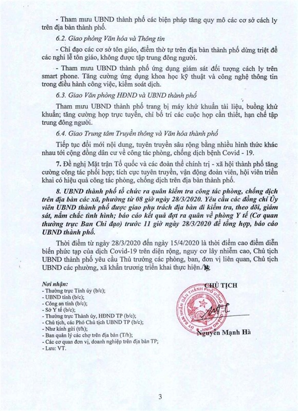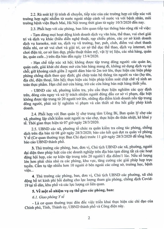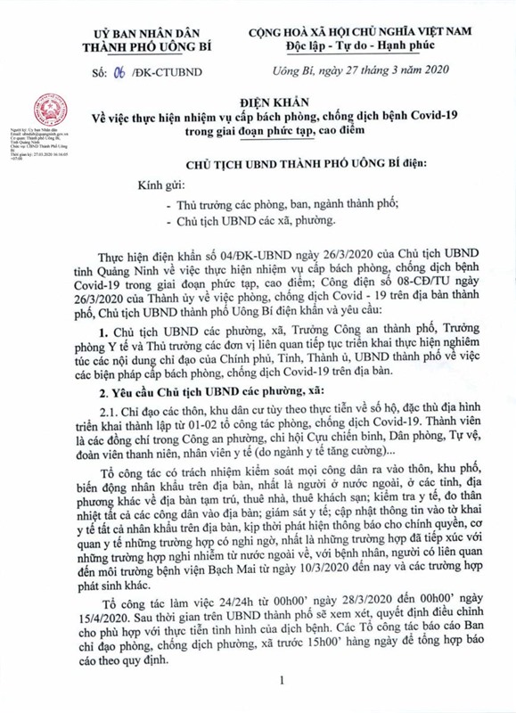 Điện khẩn số 06/ĐK-CTUBND ngày 27/3/2020 của Ủy ban nhân dân thành phố Uông Bí về việc thực hiện nhiệm vụ cấp bách phòng, chống dịch bệnh Covid-19 trong giai đoạn phức tạp, cao điểm