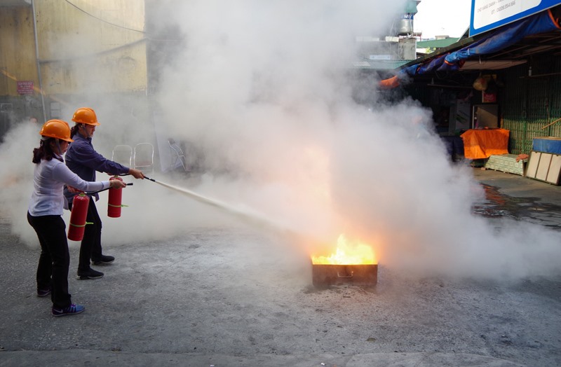 Lực lượng chữa cháy tại chỗ thực hành chữa cháy.