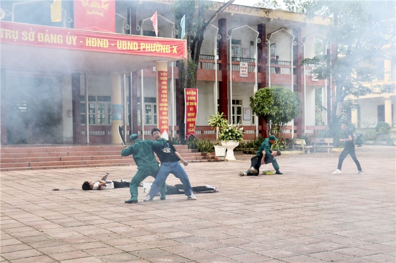 Quang cảnh diễn tập thực binh xử lý tình huống “Trung đội DQCĐ phường Bắc Sơn phối hợp với LLTV đánh chiếm lại mục tiêu bọn bạo loạn chiếm giữ”.