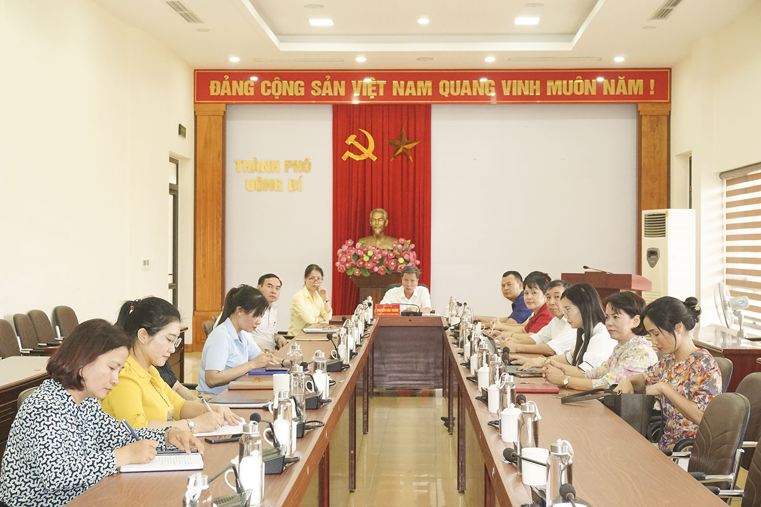 Tham gia buổi làm việc qua đường truyền trực tuyến tại TP Uông Bí có đồng chí Nguyễn Văn Thành, UVBTV Thành uỷ, Phó Chủ tịch Thường trực UBND thành phố; lãnh đạo Uỷ ban MTTQ, Đoàn Thanh niên, Hội LHPN thành phố, các phòng ban ngành, lãnh đạo UBND các phường xã.