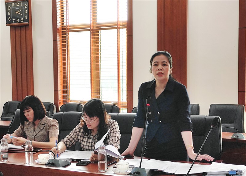 Đồng chí Phạm Thị Hải, Thành ủy viên, Chủ tịch Hội LHPN thành phố báo cáo tại buổi làm việc.