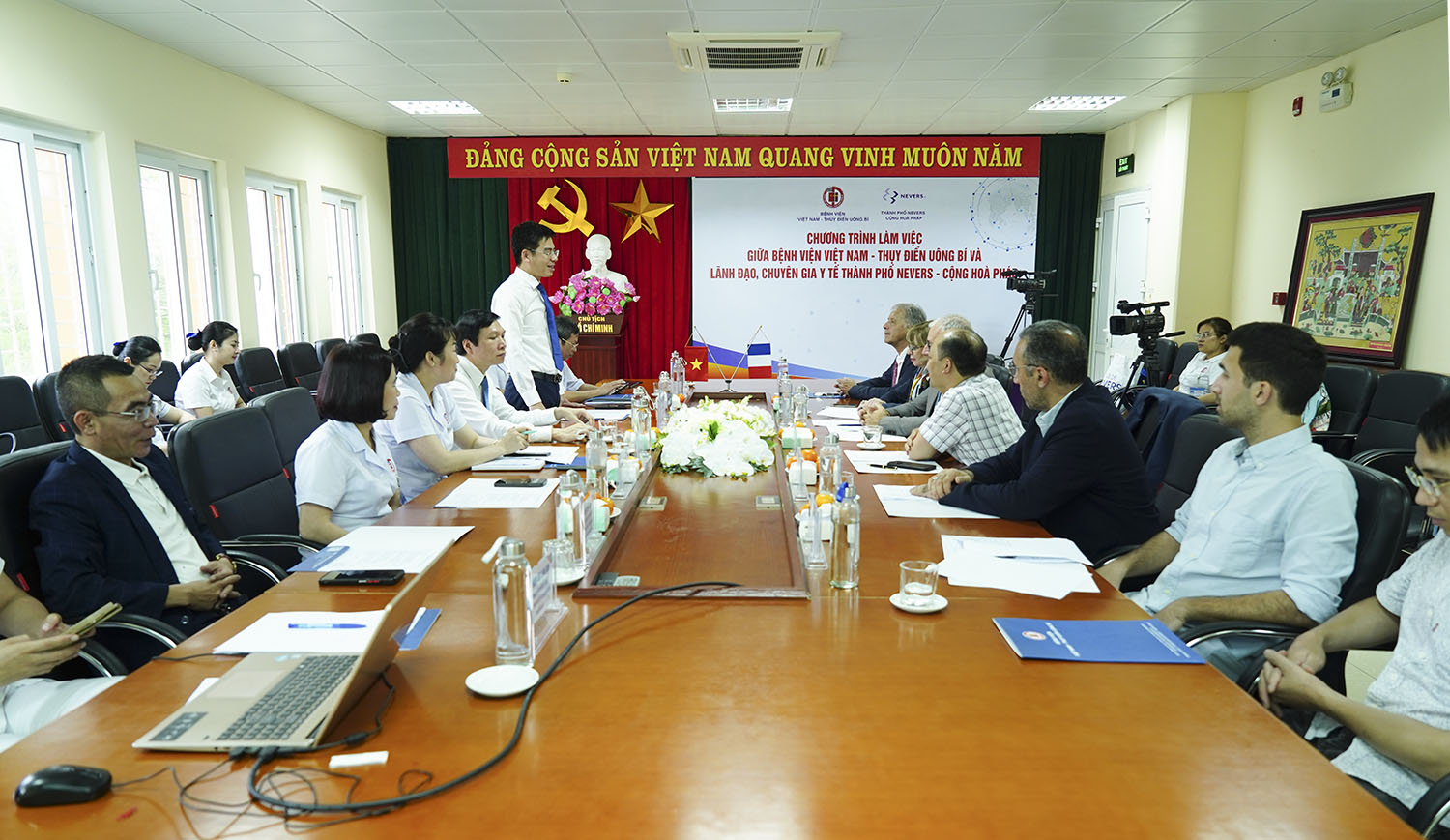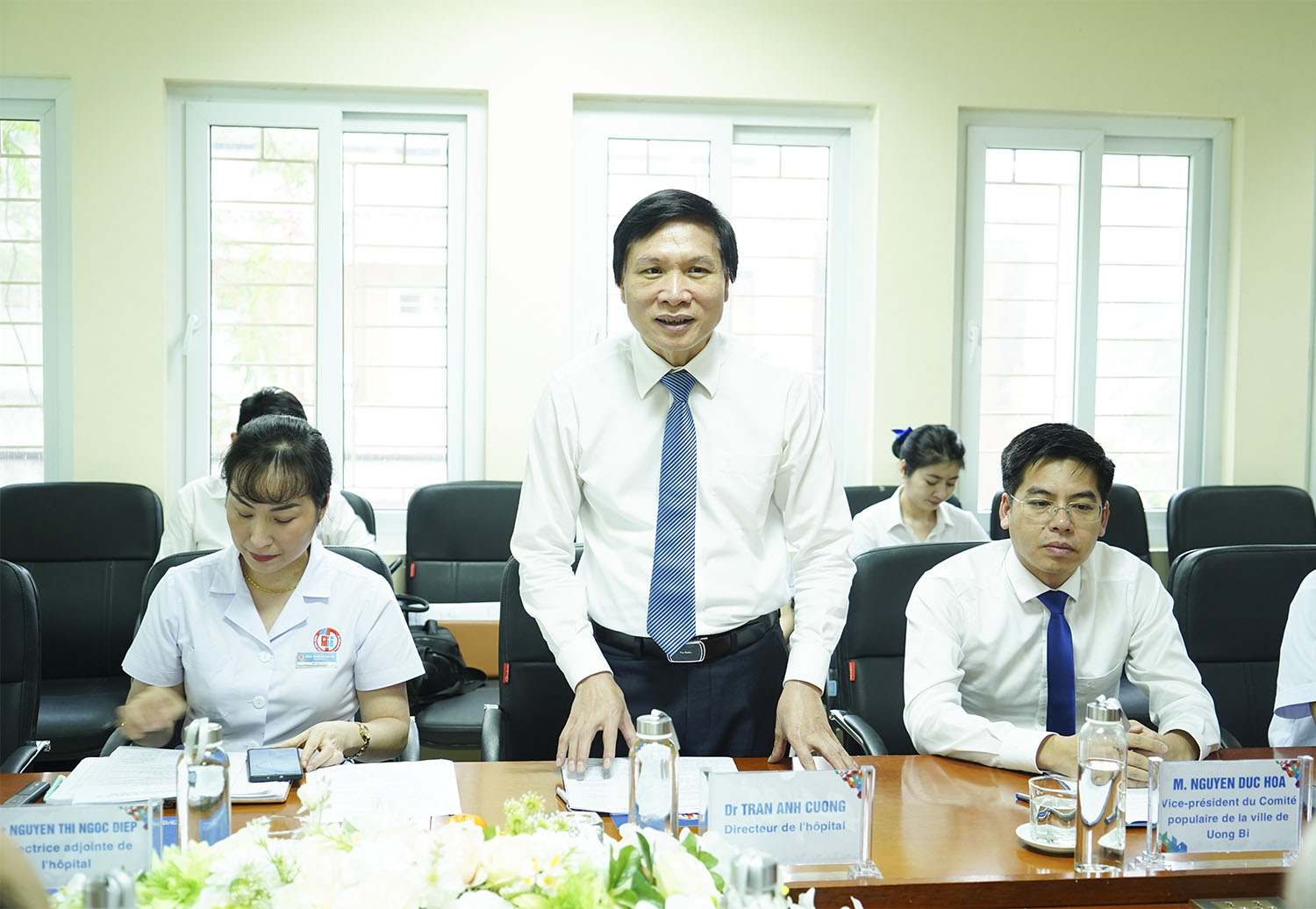 Phát biểu tại buổi làm việc, tiến sỹ Trần Anh Cường, Giám đốc Bệnh viện Việt Nam - Thụy Điển Uông Bí trân trọng cảm ơn tình cảm gắn bó bền chặt và sự hỗ trợ nhiệt thành hiệu quả của lãnh đạo thành phố Nevers và các chuyên gia y tế bệnh viện Nevers, Cộng hòa Pháp đối với Bệnh viện Việt Nam - Thụy Điển Uông Bí trong thời gian vừa qua. Các chương trình hợp tác làm việc, hỗ trợ của Bệnh viện là cơ hội để đội ngũ cán bộ, y bác sĩ của Bệnh viện Việt Nam - Thụy Điển Uông Bí nâng cao kiến thức, kỹ năng và tiếp cận những công nghệ y tế tiên tiến trên thế giới thông qua thực nghiệm, làm việc trực tiếp với các chuyên gia. Đồng chí Giám đốc Bệnh viện Việt Nam - Thụy Điển Uông Bí cũng mong muốn trong thời gian tới, Bệnh viện Nevers quan tâm mở rộng các hoạt động hỗ trợ đối với Bệnh viện Việt Nam - Thụy Điển các chuyên khoa khác ngoài lĩnh vực tim mạch, đẩy mạnh hoạt động hỗ trợ đào tạo chuyên môn.