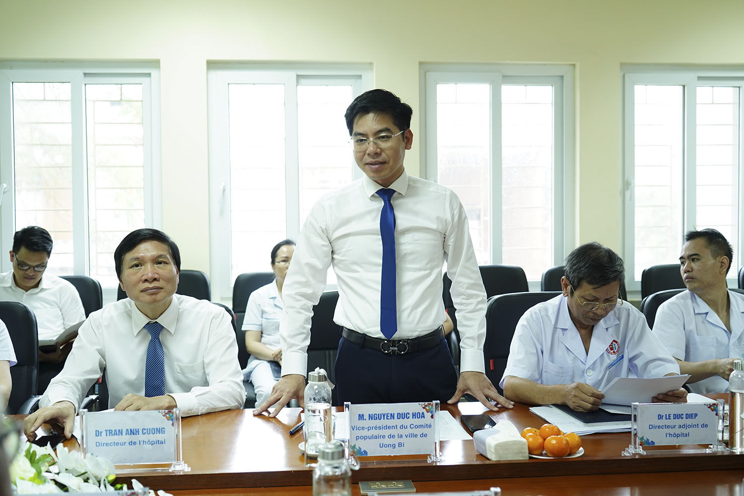 Thay mặt cho Lãnh đạo UBND thành phố Uông Bí, đồng chí Nguyễn Đức Hòa, Phó Chủ tịch UBND thành phố hoan nghênh và chúc mừng mối quan hệ hợp tác giữa Bệnh viện Nevers và Bệnh viện Việt Nam - Thụy Điển Uông Bí. Đồng thời, nhấn mạnh những nội dung hợp tác của hai đơn vị hoàn toàn phù hợp với chủ trương của tỉnh Quảng Ninh và mong muốn của chính quyền địa phương. Đồng chí Phó Chủ tịch UBND thành phố cảm ơn lãnh đạo Thành phố Nevers, Cộng hòa Pháp cũng như Bệnh viện Nevers đã dành sự quan tâm, phối hợp giúp đỡ, đối với Bệnh viện Việt Nam Thụy Điển Uông Bí nói riêng và ngành y tế thành phố nói chung; mong muốn 2 đơn vị sẽ tiếp tục hợp tác sâu, rộng, mở rộng lĩnh vực hợp tác để Bệnh viện Việt Nam – Thụy Điển Uông Bí là địa chỉ tin cậy trong việc khám, chữa bệnh cho nhân dân.