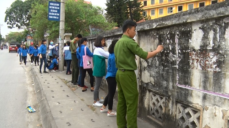 Lực lượng đoàn viên - thanh niên phường tham gia bóc, xóa biển quảng cáo rao vặt sai quy định tại tuyến đường Thanh Niên.